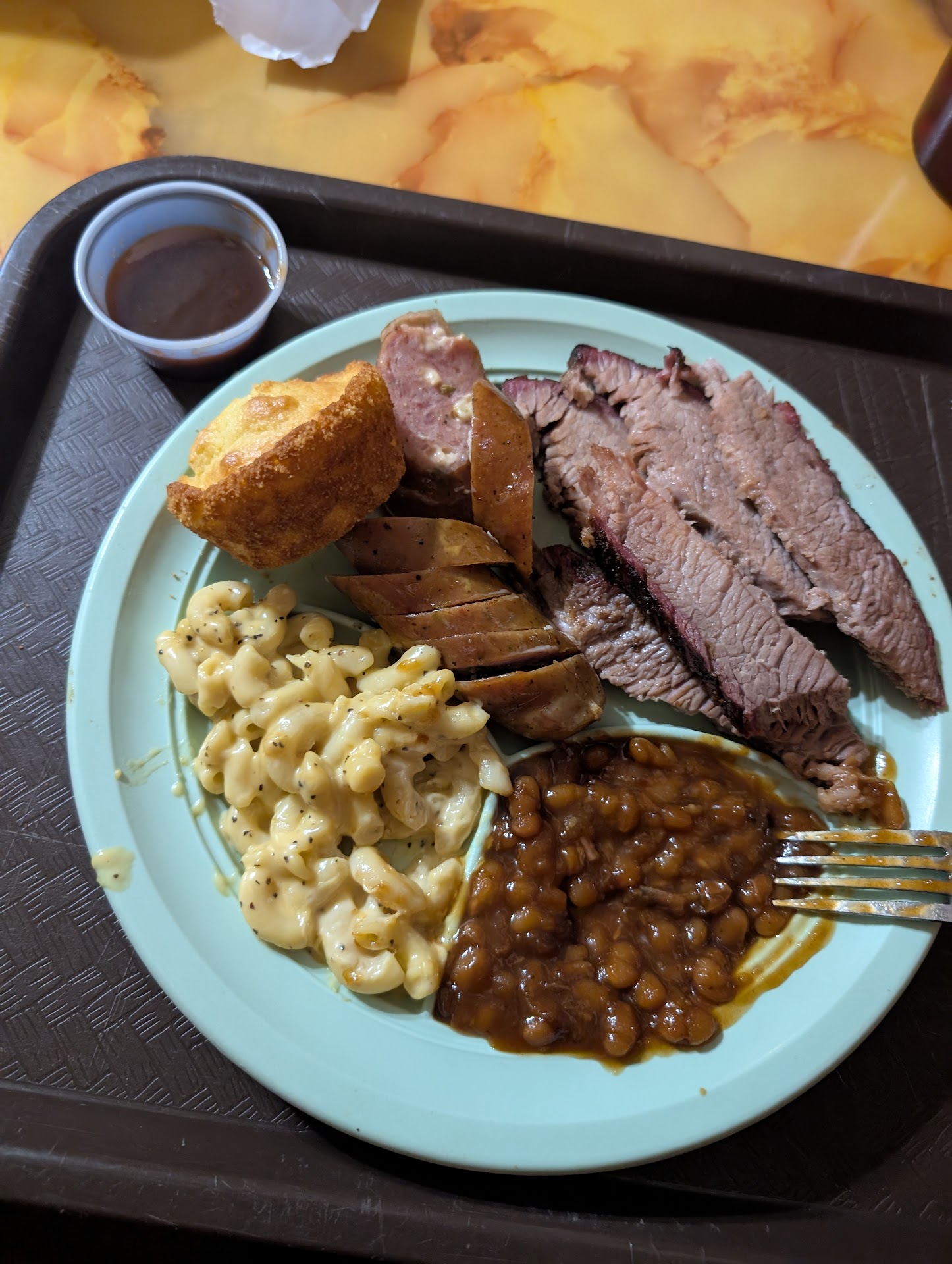 Read moreStopped in while driving thru Emory. Thought I would give them a try. Stood in the line for a bit before someone acknowledged me. Some of the sides looked a little dried out. I got the 2 meat plate (brisket & sausage) with potato salad and bbq beans. The brisket was tender and super delicious, full of flavor. I wasn't thrilled with the sausage, seemed a little dry and not much flavor. I especially enjoyed the potato salad, reminded me of what my wife makes. 2 thumbs up for the potato salad and brisket. The bbq sauce was flavorful but I feel it needed to be a little thicker, seemed to be really thinned down. Atmosphere was visually cool, really needed some music though.