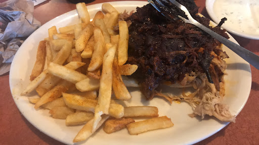 I went to get the Pulled Pork Sandwich meal for a late lunch and the Pulled Pork is definitely tender and very easy to chew. I like how it's served plain so you can add your own Choice of Regular or Spicy BBQ sauce. I got the Baked Beans and fries for my sides but wished I would of got Double Beans because when my order finally came after waiting about 15 minutes they were warm at best and almost tasted kind of old with some of them being real crunchy and others just right. I could tell though that if they were hot fresh out the Fryer they would be delicious so if ordering fries make sure to request fresh or no salt. The sandwich was super delicious but at the same time wasn't as warm as I would of liked. The Beans though were definitely warm and they were tied for first with the Pulled Pork Sandwich in the taste department. Will I go back, Definitely, but when I do I'm getting Double Beans and maybe a slice of cheese for my sandwich or a pickle slice.I would of liked it to be a little better lit inside and maybe have the food brought out hotter. It seemed more exspensive too because I use to only pay 10 something for the same meal but mine came up to 13.29 but I paid 18 to include the tip since the waitresses was only working by herself and busy. This place is very tasty though and still never dissapoints for...