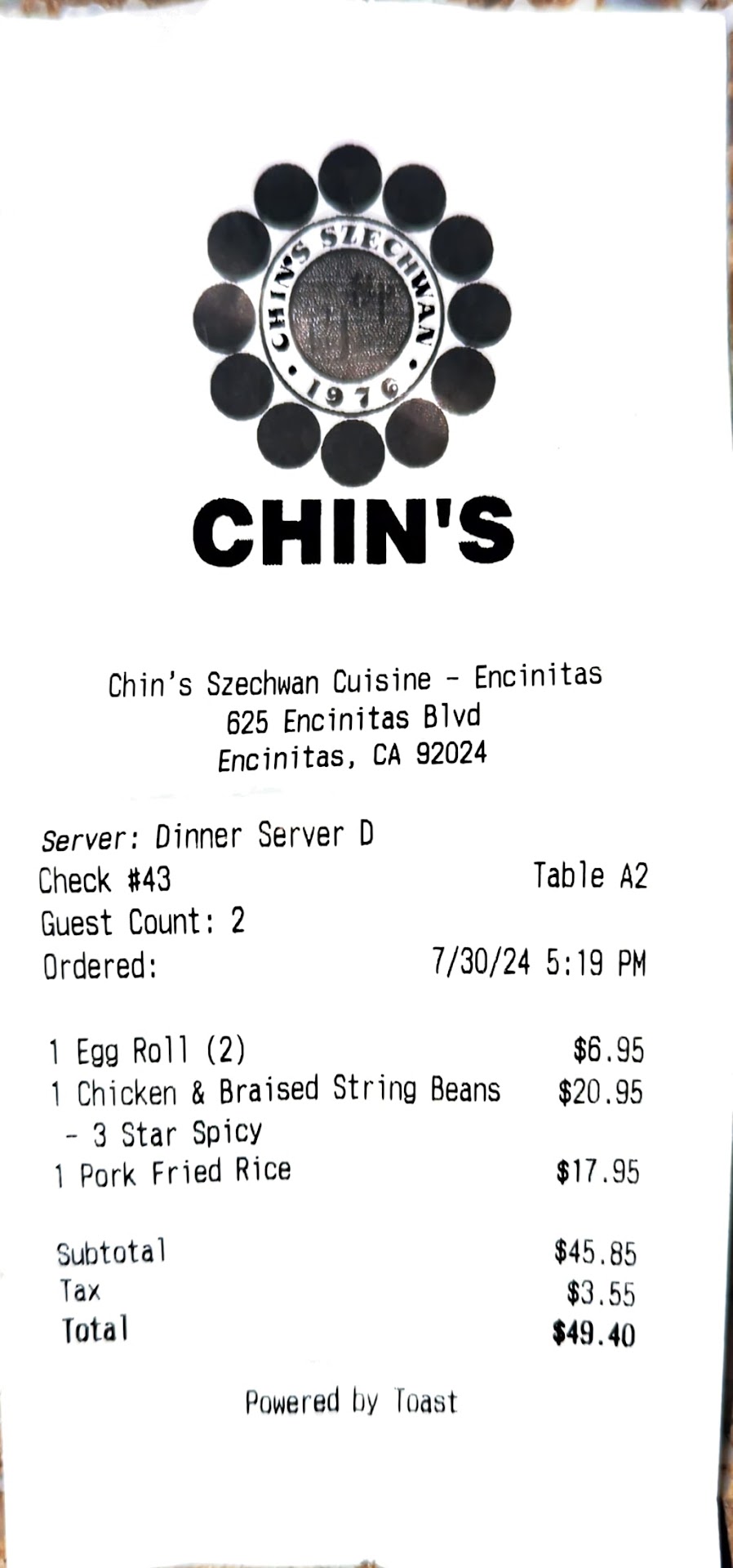 Read moreI have to start by saying we use to love Chins. We've been customers for a long time. Unfortunately the quality of the freshness of the food started to fail and not be consistent. We stopped going for a bit but returned to enjoy their generous lunch specials. We enjoyed bringing family and friends as was the case today. We started with shrimp wonton soup but the shrimp tasted awful. I didn't say anything in case it was just me. I noticed one other family member put their shrimp on the side of the bowl. Going on to our meals, we had 2 honey walnut shrimp oreders and Kung pao shrimp. This is something we have ordered many times. Again the shrimp tasted terrible like they were spoiled or going bad. I said nothing until I noticed the other person not eating it as well. When I finally asked, they thought the same thing, that the shrimp were spoiled. We kindly and I promise it was very kind, told them we like their restaurant and this had never happened before but the shrimp could possibly be going bad and did not taste good. He answered, maybe we used a different distributor but I will tell the manager. We heard him speaking to the manager and waited and waited. He finally came over and asked if we wanted to take it home. We said no. He picked up our plates and returned with our check. The manager never came to speak with us, they didn't offer even a 10%discount or replacement meal. We are locals and want to support local businesses but not with the risk of getting sick or bad customer service. P.S. We are the type of people that are quick to put a good word in not just complain so I don't do...