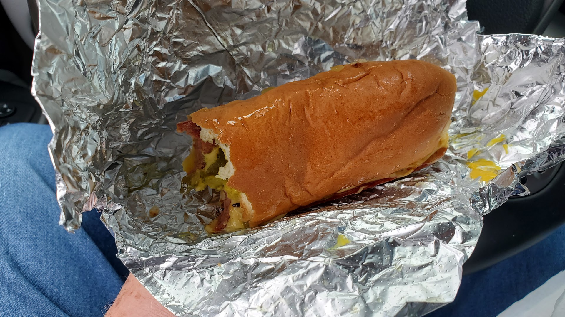I purchased a Bacon Cheese Dog with mustard and onions. The hot dog is small and reportedly beef, sliced in half (don't know why), the cheese is a basic yellow/wax type cheese which was cold, and the bacon was diced but ok. With tax, it was just under $10. I recommend going to the store and getting a pack of beef dogs and buns for the same price (probably fit the onion into that budget as well).