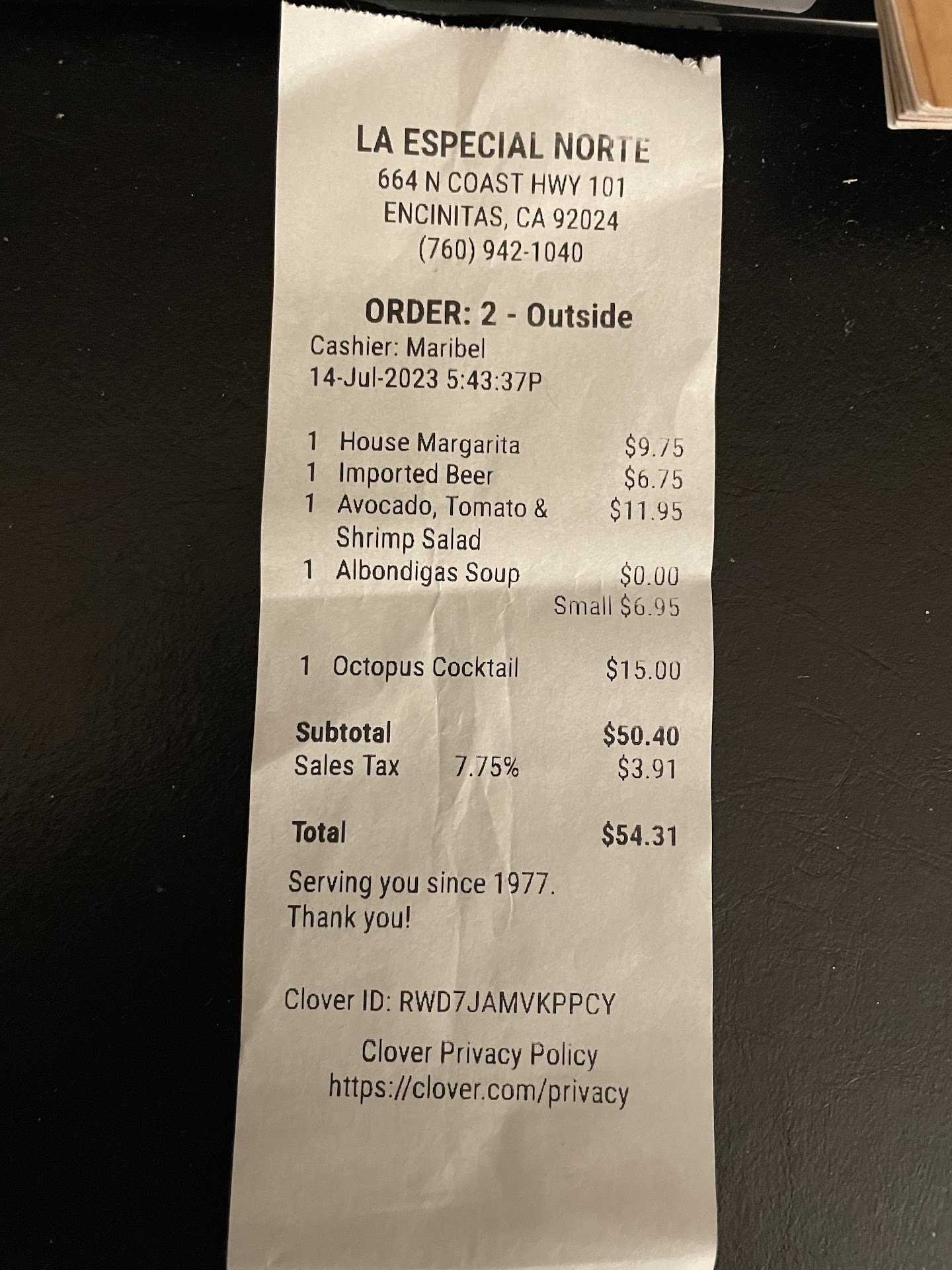 Read moreThis review is 30 years overdue. Why? Because I didn't want to make La Especial Norte more popular than it already is. I didn't want to wreck the SoCal beach neighborhood vibe that seems to be built into the kitschy decor. But I find myself leaving the area, so this review is one of the last things I need to wrap up. I will miss the soups, especially the tortilla soup pictured below. In recent years the soup has been served warm so I ask to have it hot. I add 2 spoons of salsa, and that elevates it to the best tortilla soup I've ever had - apologies to my wife who has tried to replicate it. Seafood dishes are wonderful, especially the fish tacos. Pictured below as well is the enchilada platter. The beef enchilada has shredded beef and not the ground beef so many other restaurants use. I always ask for extra cabbage slaw. This is the only Mexican restaurant I have been to that serves it. In fact, I think it's better to substitute the cabbage for the rice on any platter. Also, avoid the sour cream and ask for red sauce instead. Skip the margaritas and other mixed drinks, I don't see the value. Instead get a Corona or better yet a Modelo Negro. This isn't fancy food. It is basic food done really well. The portion to price ratio is fantastic. The proof is the number of families who jam into the place every weekend night. If you're wearing shorts, sweatshirt, and flip flops you'll fit right in. For a restaurant to be so popular for so long is pretty much all you need to know. Get off the 5, enjoy a slower trip on the 101, and stop in Leucadia for some authentic Mexican soups and...