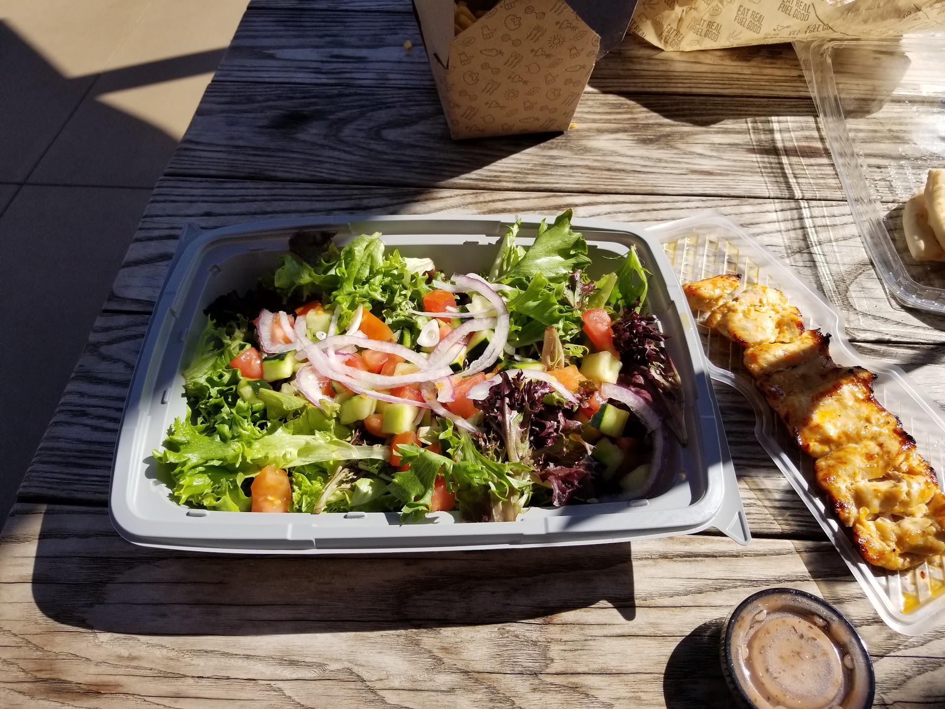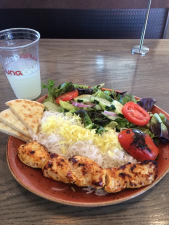 This is my first time to a Luna Grill in several years, if ever. I came here today bc it was recently added to my air miles list of places to eat for frequent flier miles. I must say, this place is pricey, very, for a fast casual place and its portions. I got the Chicken & Gyro Meat signature plate that includes basmati rice, house salad, and 3 small wedges of pita and tzatziki for $15.85. That almost sounds like a sit down restaurant price. The portions of meat were adequate as was the salad but overall for that price, seems a little high. Its not like the gyro meat was juicy and hot right off the spit. What was quite a disappointment was the 3 tiny wedges of pita. Its the cheapest item on the plate and at least 1 full size round piece would have been significantly better and maybe I would consider this review differently. For the price, to skimp on something like pita seems pretty silly. I see several reviews saying the portion sizes are smaller. I can't compare on that at all but I expected a little more for, with drink, came to over $20. Another strange thing was when I was sitting at my table waiting for my food, another customer just leaving actually did come up to me and ask if I thought I paid a lot for the food, if I had also paid over $20, and that he was disappointed in paying that much for a small lunch. I couldn't...