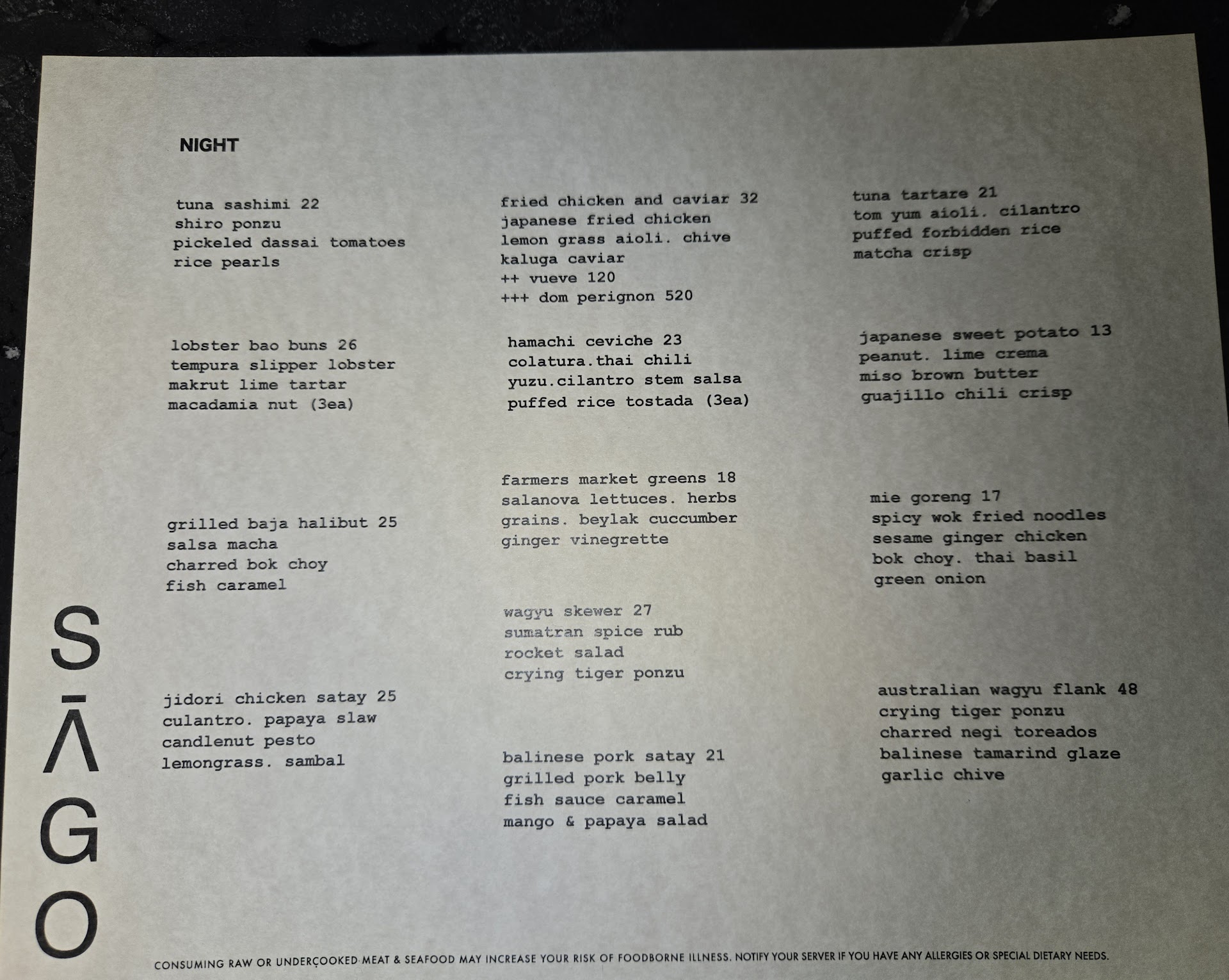 The server made it known to us that the menu was Asian fusion and tapas style (shared small plates). After trying the food here, I would say they are more Asian fusion CONFUSION as the flavors were clashing and seemed like the dishes didn't know their identities.. don't get me wrong Asian fusion can be done very well but SAGO does not do them well at all.. We ordered the Lobster Bao Buns, the Balinese Pork Satay, the Wagyu Satay, the Fried Chicken Cavier and the Mi Goreng. The Lobster Bao Buns were covered in a sauce that gave the whole dish it's flavor and the bun was kind of cheap and stuck to the roof of our mouths. The Balinese Pork Satay was pretty small for the amount they charged and it lacked flavor. The Waygu Skewers were not special and I honestly questioned if it was Wagyu because it taste like a regular steak.. the Fried Chicken and Caviar was fried nicely and had decent flavor but unfortunately it was undercooked.. still pink inside. And the Mi Goreng was undercooked.. the noodles were hard and the flavor had way to much sugar. We were starving so we ate it but we weren't satisfied after..