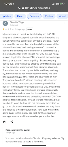 My coworker an I went for lunch today at 11:40 AM , (only two tables occupied out side) when I asked to the server Katie if we can seat at any table she said, "sure" in a unpolite manner, then she trough the menus at the table with out any "welcoming manners" I ordered a coffee and shebring me the coffee in a used dirty cup ( pictures attached) when I asked her why my cup has a stained ring inside she said "Do you want me to change the cup or you don't want anything" But not only my coffee cup, also was a bad chipped and dirty plastic cup for my coworker water as well (see pictures attached), Then when she passed by our table and keep walking by, I mentioned to her we are ready to order, she turn back an pointing at other table and she yelled at me" They where here first" with no courtesy. We observed how she talked to other costumersusing words like " honey" "sweetheart" or simple attentive way. I was there with all my family last month and we were please with the plate taste and service, but today I was really bad, we received a different and unhealthy service (COVID-19 risk) we feel mistreated, my coo worked mentioned that we should leave, but we did not have any more time to go other place and returnto work on time. We stay there and finished a well prepared dish, how ever we are not going back to this place, We look for the owners or managers name and there no other...