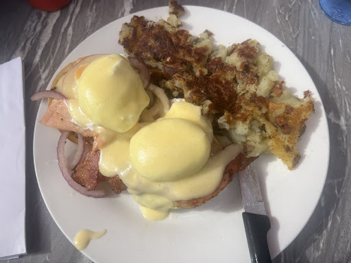 We chose a table outside on the sidewalk and with great weather that was a nice option . The menu is quite varied which caught my attention when reading the review. If I were in the area, I would return often and try many of the dishes on their menu . However, I fell back on one of my favorites . I ordered the Eggs Benedict with bacon and, as the server promised, the hollandaise sauce was outstanding. I loved every bite! I opted for potatoes and my partner opted for fruit so that we could share. It was a nice option that we could modify the fruit combo so that I could eliminate some things and have more of what I do enjoy. We chose a biscuit for our bread and I was pleased with the overall results. I don’t find biscuits in restaurants to be of the correct texture, fluffiness, and flavor. However, This biscuit was satisfying enough that I would order it again. The quantity of food was generous, but not over the top so that We were both able to finish our breakfasts. This restaurant would be on my list to stop at again if I were...