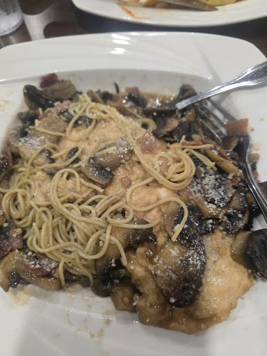 This is your typical italian restaurant/pizza joint that you find in every town. Went for a fun celebratory lunch for my Grandson. He and his friend were in their booth, my Bff and I were in another. Boys started with 2 Rootbeer sodas and one order of Fried Mozzarella, my Bff had a cup of their seafood chowder and I ordered a bowl. It was very flavorful and creamy. She had a gingerale and i chose a glass of merlot. The boys ordered a large pepperoni pizza 🍕 and our table ordered a chicken Avocado 🥑 wrap with onion rings and an order of their stuffed mushrooms. The boys enjoyed the pizza, my bff enjoyed her wrap and the onion rings were crispy and good. The seafood stuffed mushrooms had a bizarre sweet taste that mimicked miracle whip mayo and diced pimento 😬 it was sweet, not savory as one would expect. I ate about 3/4 of one and sent them back. Totally not enjoyable. For dessert we originally wanted cheesecake 😋 but, they were out. We then asked about their cannolis, they were out of those as well. My friend and I settled for a piece of carrot cake to split and the boys each got a slice of chocolate lava cake. The boys devoured their desserts and said they were tasty. The carrot cake had an odd texture and tasted like play-doh 😬 did not eat my half, my bff said it wasn't great but it wasn't bad and ate it. It was our first time dining here. It's a steady-busy place on a Saturday. Our waitress was pleasant and accommodating (she never gave us her name) I ended up having a 2nd merlot while my bff and I sat and chatted. Total for our afternoon was $124.53 (felt this was kinda pricy for what we had tbh) left the waitress her tip and headed out. Not sure if we'll be back or not. Wasn't overly wowed...
