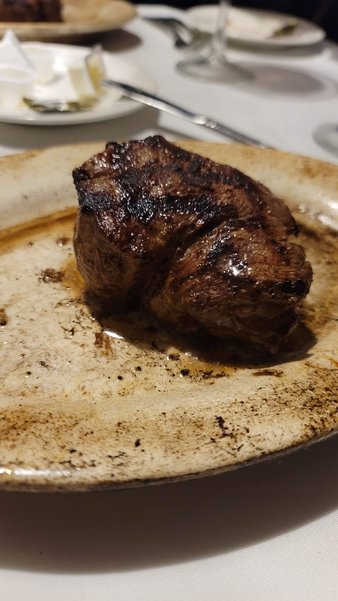 My brother had picked this place for nostalgic reason since our family had been there 30 or so years ago, and I brought my family with me this time. We ordered a few drinks, some appetizers, salad, porterhouse for 3, a ribeye, a pasta, and some sides. The appetizers (oysters and crab cakes) were just meh, salad was ok, porterhouse was cooked properly (med rare) but could use a bit more seasoning, the ribeye was unacceptable. The ribeye ($53) was half an inch thick (strike 1) and it was 80% cooked with a very slight pink and definitely not the medium we had ordered (strike 2). When we raised it to the attention of the guy (I believe the manager/owner) that the steak is overcooked, he was skeptical and went to confirm with our waiter what we had ordered. And then he came back with a picture of steak temperatures to argue what a medium steak should look like (strike 3), mind you…the color in the pic did not look like what we got. Finally they came back with a replacement ribeye (slightly thicker maybe 3/4 in) which was rare (strike 4). The manager must have noticed that it wasn’t cooked enough so he brought over a hot plate and said “here you can cook it to your liking”. We were so done with the restaurant by then that we were speechless. I was going to leave a lower tip because of our experience but since it was Christmas Eve, I decided to be fair to our waiter who wasn’t being rude to us and left a 18% tip. Needless to say, they have lost a customer for good. I am shocked to see an establishment in business with this level of service and...