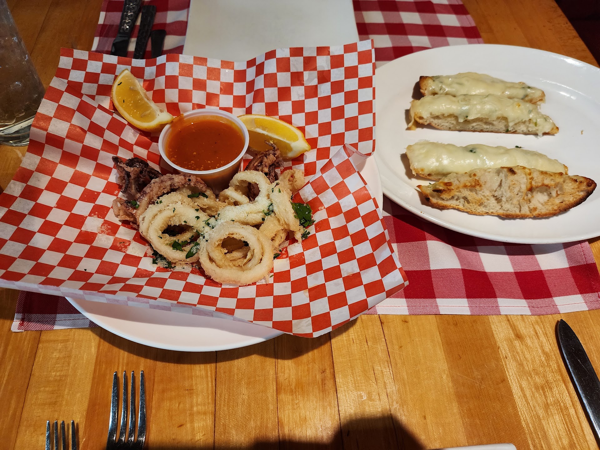 We kept it simple. Came in to try for the first time as a little celebration, right when they opened for lunch. Ordered a cherry Italian soda with all the frills, some calamari, some garlic cheese bread, and a plate of chicken alfredo to share.