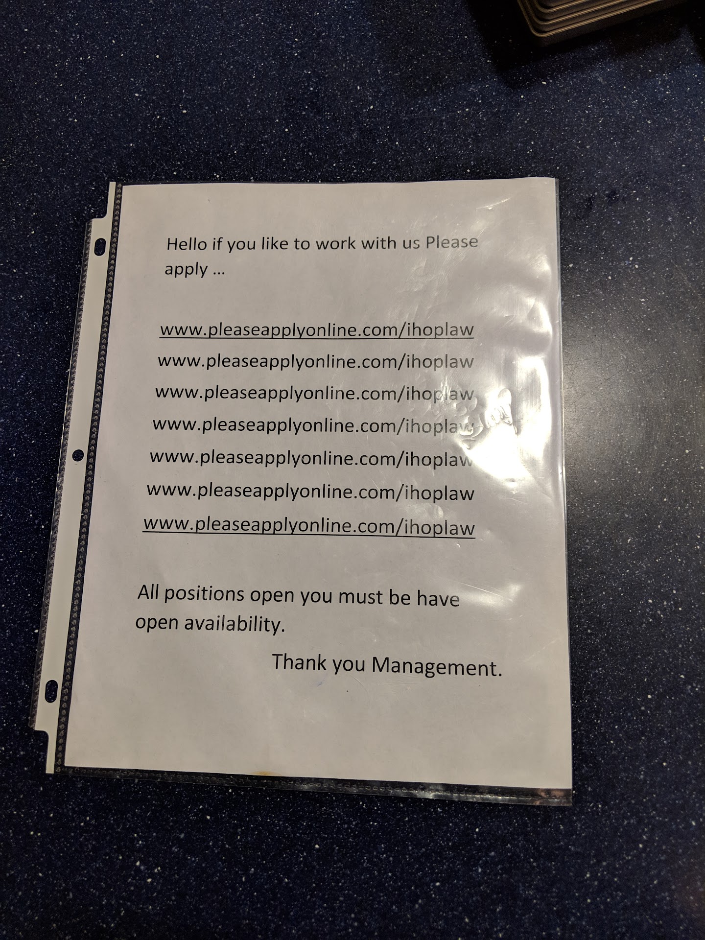 Of all the things I just can't, this place is the can't-iest. Things were simple: it was 4:30 a.m., we were hungry, and they had no other customers. Getting seated was easy enough, but our experience worsened from there. 11 minutes later, our order was taken. And our glasses of cloudy iced tea arrived almost 10 minutes after that. We were pretty hungry so I ordered the appetizer sampler. 27 minutes later, the appetizer sampler arrived with our entree.I asked the server if I should have specified that the appetizer sampler be delivered before the entree and she replied that I should have. Silly me, I suppose. The appetizer sampler was to be served with marinara and our choice of honey mustard or ranch and we chose the mustard. The mustard arrived in a large bowl, but the marinara was absent. I mentioned the lack of marinara and the server was surprised it was even offered. I had conveniently brought up their menu on my phone and pointed out her mistake. Ms. Server disappeared for a few more minutes returning to inform us they had no marinara. Fine. Worse things have happened and cheese sticks without marinara isn't the end of the world. Unfortunately, we still had to deal with entrees which arrived with the appetizer. For my entree, I ordered the Jalapeno Kick Ultimate Steakburger. "Jalapeno Kick Ultimate Steakburger? Alright, I'm here for this." I kept things simple by asking for no jalapeno mayonnaise, please. I'm assuming that what she heard was "no mayo and no 'spicy blend of sauteed jalapenos, serranos, and onions.' I pointed out the lack of toppings to Ms. Server and referred to the menu description on my phone again. She disappeared for a moment returning to ask if we would like ketchup or hot sauce. To her credit, Ms. Server gave us a 10% discount on the total of the bill after I concerned my disappointment. This amounted to $2.60-something. I made up for it with my 9% tip. I'm not a monster. Although we won't be back, I wish Ms. Server luck with her impending performance improvement plan. I'm including their printed and sleeved request for job applicants just because of the lack of punctuation, inappropriate capitalization, excessive used of ellipses, etc. One star:...