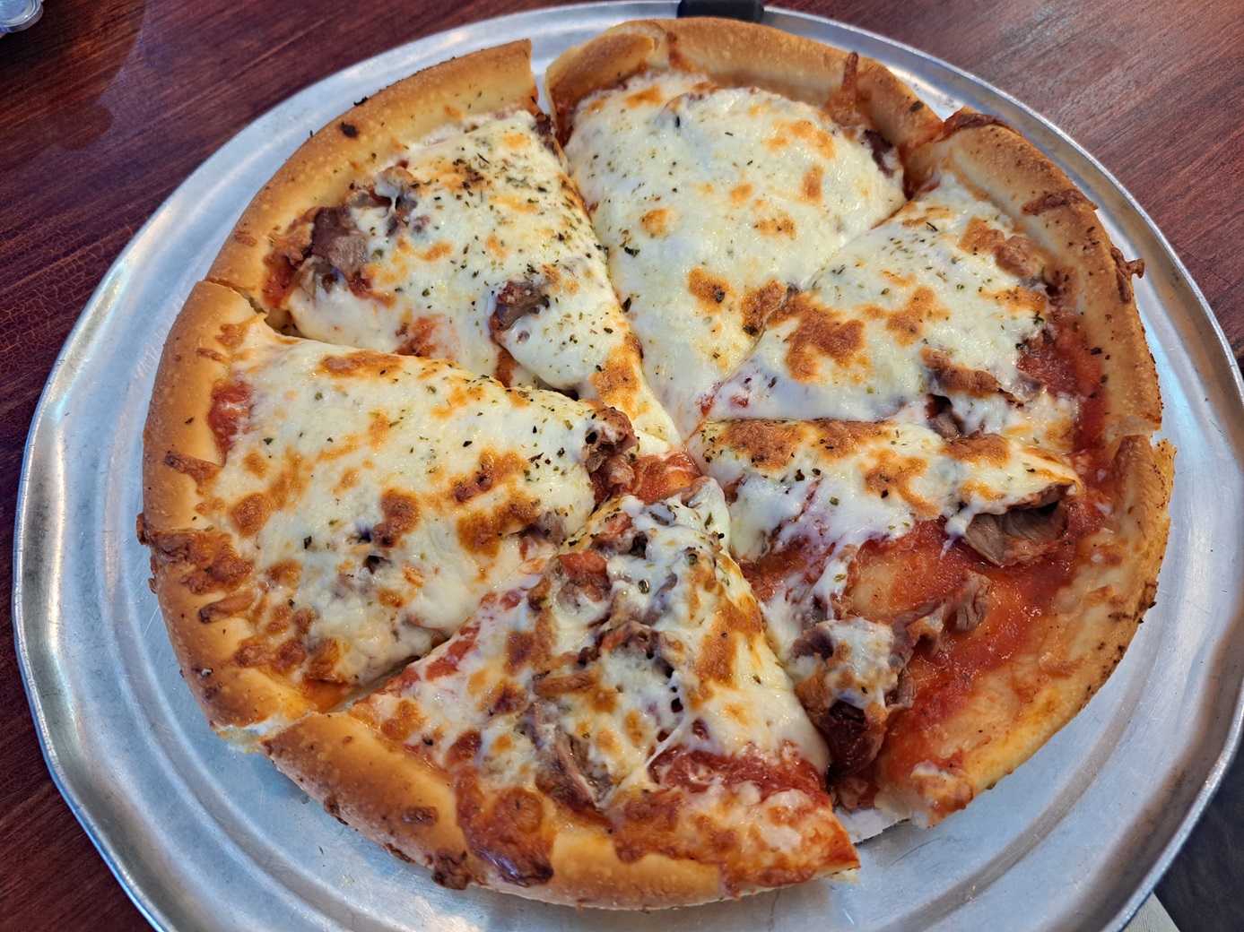 Aaaaand strike three, âbuild your own pizzaâ...đthe pizza I wanted was a Philly cheese steak pizza... Alfredo sauce, provolone and mozzarella, shaved steak, onions and mushroom. Boom! The response I got was âwe dont do anything philly, we are a Chicago pizzeriaâ so she suggests something close-ish to what I really wanted, but it was just more lazy. They bring out a pizza that looked great but was actually made from frozen dough, bland sauce and sliced into small squares.