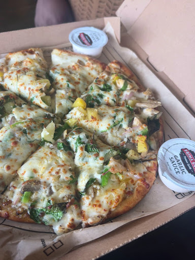 I ordered a personal-size pizza and built it with white sauce, chicken, red onion, mushrooms, banana peppers, and jalapeños—a great mix of flavor and spice. The ingredients were fresh, and the crust had a nice crisp to it without being overdone. The pizza came out hot and fast, which was perfect for a quick lunch stop.