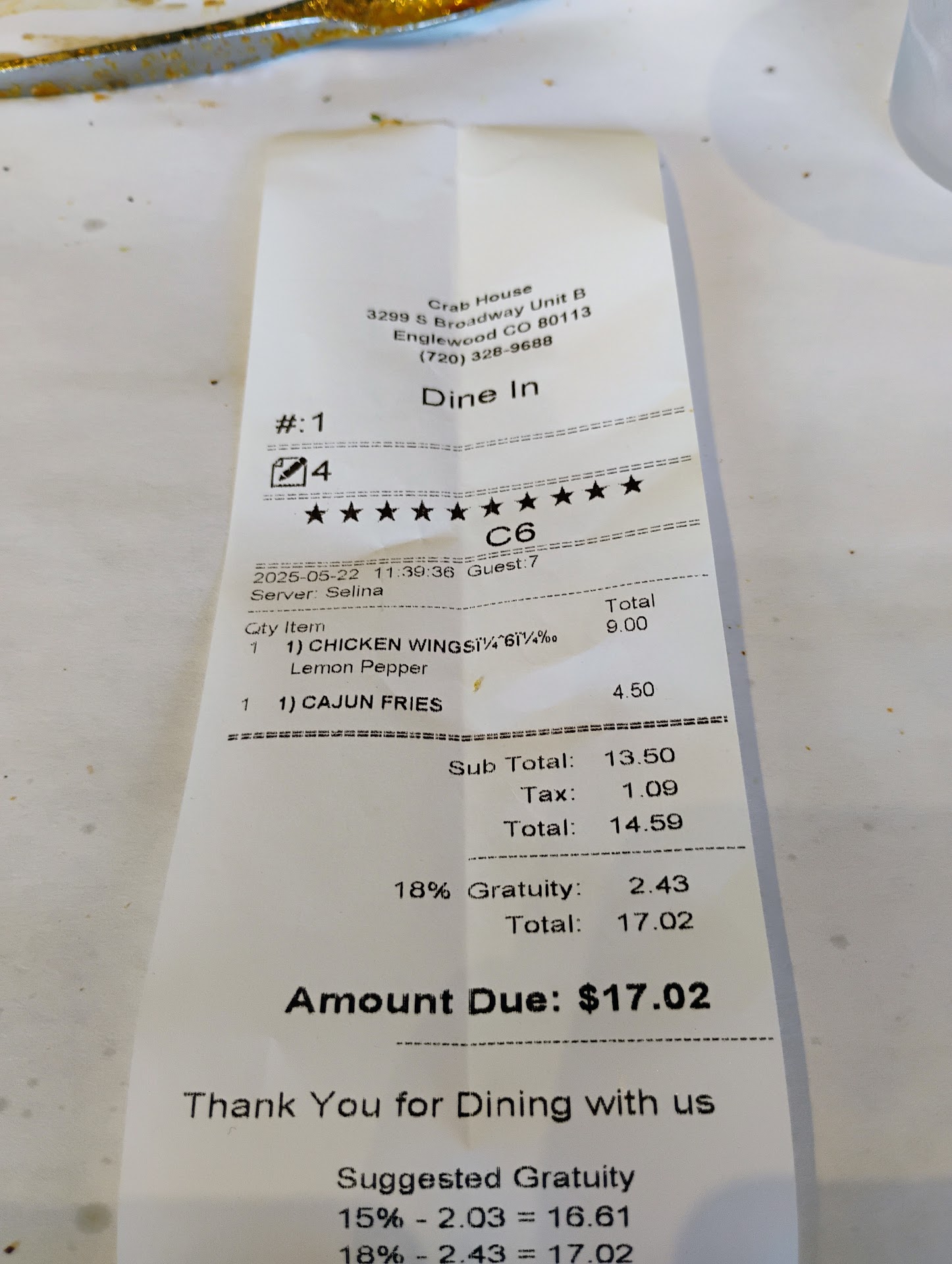 Our total bill was $38.36 which we split between two credit cards. One card was charged $19.18 and mine was charged $57.54. Math was definitely not mathing! I asked the waitress to refund my card and charge the correct amount. She took a long time to void the $57.54 then proceeded to charge me $19.45. I asked her why it is a little more than half? She said, "this is a new transaction and I added a little more for the kitchen." What?? It's not that I can't give an extra 27 cents but it's the principle, especially after attempting to charge us double the amount of our bill! If there is an extra charge for the kitchen staff, it should have been clearly stated on the original check! She then told me to deduct that extra amount off my tip. Pretty presumptuous for lack of service and shady accounting. It was our first time at the Crab House and...
