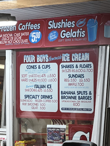 Read moreI have been going to Four Boys ever since it changed from Jack Frost. The double fudge brownie is my favorite flavor. Great quality ice cream. For $4, I get a small cup, but they give you a pretty big serving. They offer hard and soft ice cream, shakes, sundaes, barges, Italian ices, and more. On busy summer nights, the line can snake from the window to the street and then some. There is some outdoor seating (one table is too close to the dumpster though). Parking is limited and a little difficult to maneuver because the store is right by the street. The store is manned by high schoolers. Service is typically...