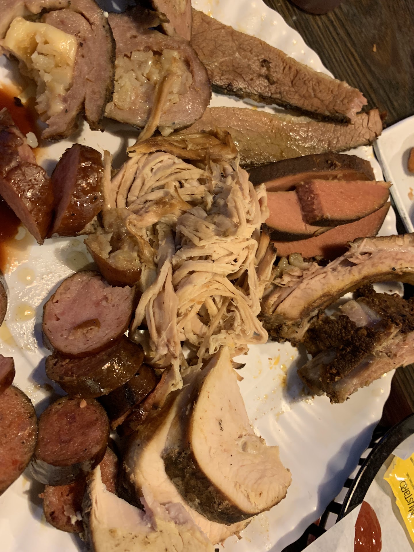 Read moreWent here today, my husband, son age 7 and myself. I ordered the meat sampler with green beans and onion rings. I will start by saying our waiter was young but very pleasant and kept our drinks filled. The sweet tea is very good. My husband and I both liked both the onion ring and green beans nothing exceptional but well executed. The fried cheese curds where really good! When my meat plate came out there was a brown hue on everything and not much color. My guess would be an electric smoker. Everything on my plate was dry and you could see where all the meat was previously cooked and then flat grill...no problem except they killed the moisture! Nothing was really great just okay at best. Some of the sausage was so over smoked what would have been really good seasoning was smothered by smoke. We are from Texas but travel all over and we have had a lot of deferent styles of BBQ. There wasn’t anything here I’d be in a rush to...