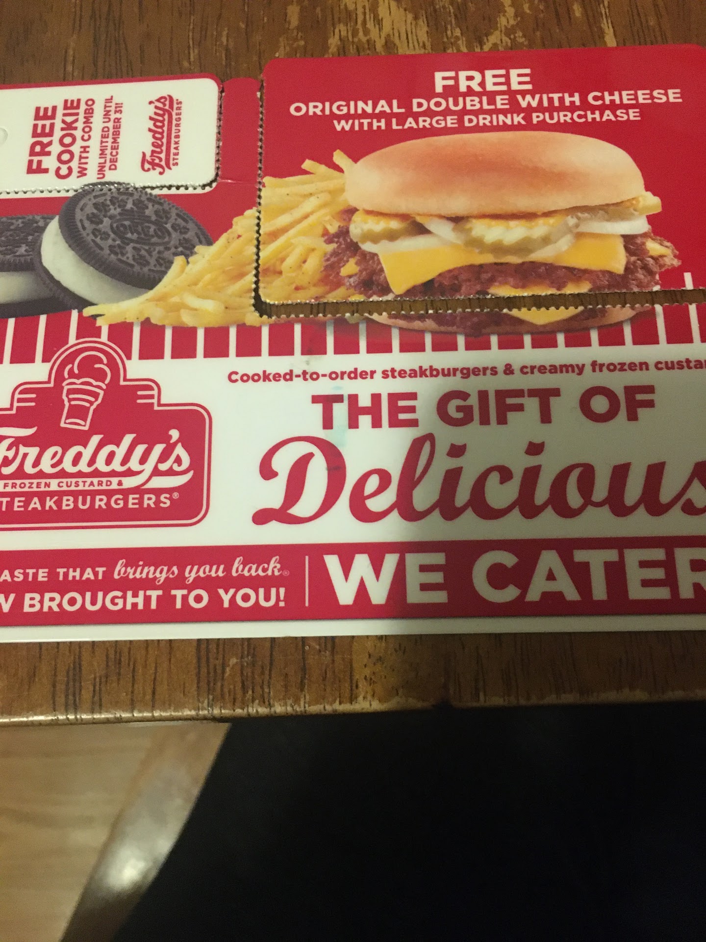 Read moreWe've been wanting to go to Freddy's to try their Burger's, finally today Friday April 20, we did. The atmosphere was great background music not too loud can enjoy nice conversation while waiting for your meal. We placed our order, I ordered a cheeseburger made with mayo lettuce tomatoes and grilled onions. We waited about 15 minutes or so then our number was called, anticipating what my Burger was going to taste like my mouth was already watering, well needless to say I didn't get my grilled onions however the French fries were delicious they cut them so thin OMG I loved them. I wasn't going to mention anything about not getting my grilled onions on my Burger but I did not sure if I spoke to the manager or not but she graciously apologized and handed me a complimentary combo meal on my next visit. I thanked her and I will definitely be returning to Freddy's...