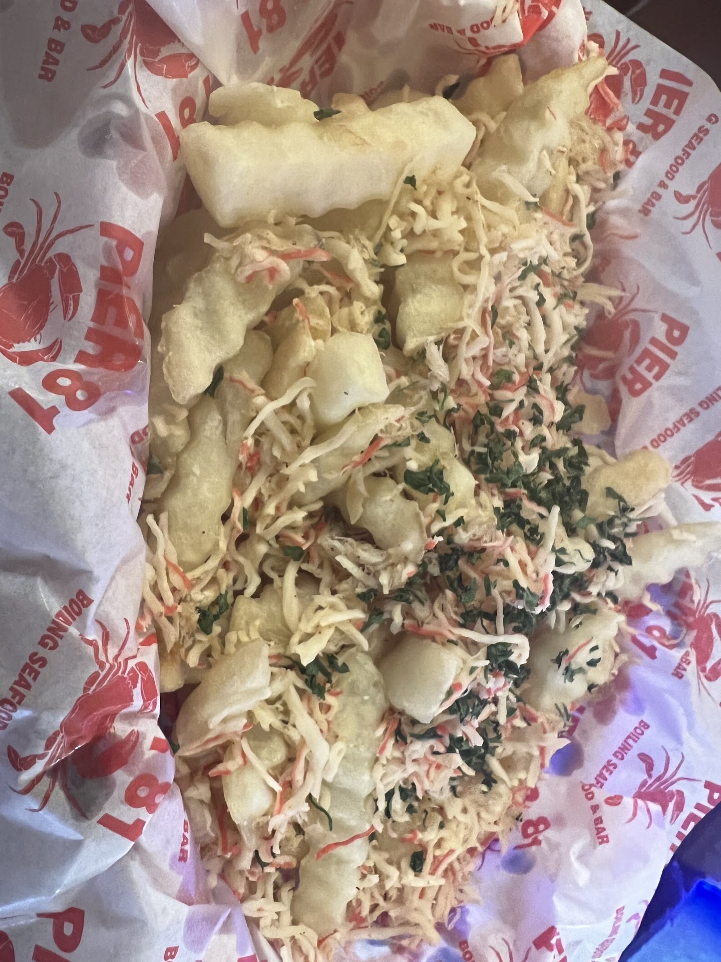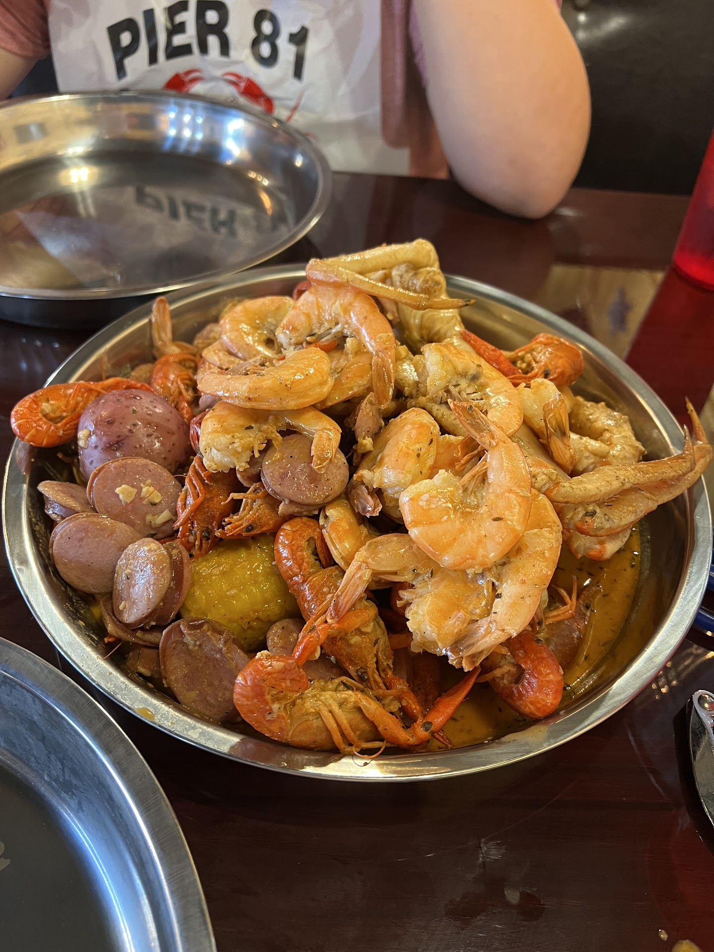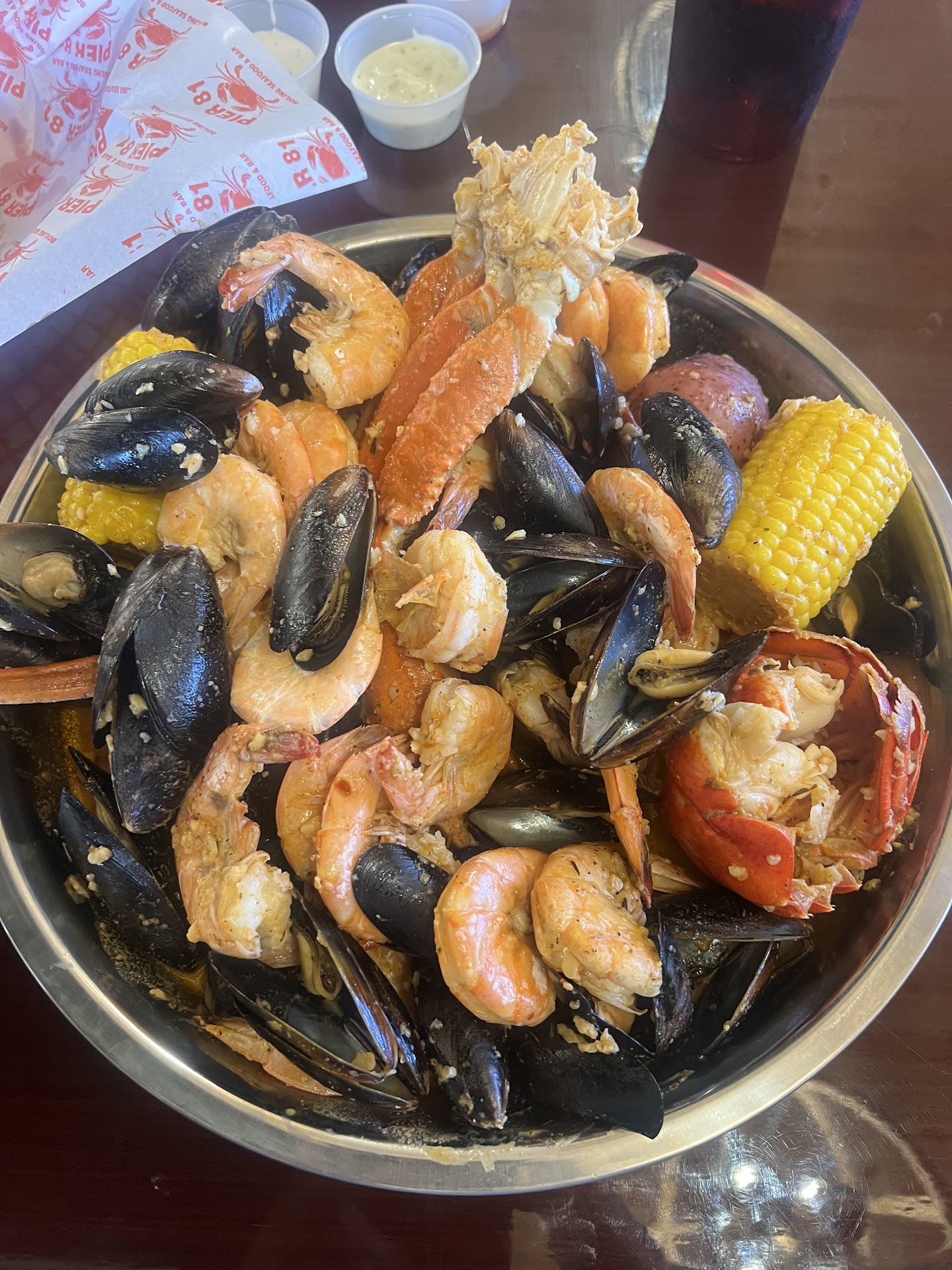 So I just tried Pier 81 for the first time since their opening and I was thoroughly impressed. I started off with an order of hush puppies, fried calamari and 2 raw oysters(1st time eating raw oysters). The hush puppies were full of flavor and the calamari was absolutely delicious and fried to a perfect golden brown. Being this was my first time trying raw oysters I decided I had better put a bit of Tabasco sauce on them to help the mental block I was putting on myself. After putting the oyster on to a cracker, I opened wide and was delightfully surprised at how yummy and good they were. Moving on after the appetizers I decided to choose the largest pre-picked boiler they offer, the Dreadnaught. I chose to get a snow crab cluster and lobster tail as my main meat options and then went with 1lb of shrimp and 1lb black mussels as my add-onâs. Next came the difficult choice of what seasoning and spice level. I didnât stray far from my norm and went with spicy Cajun. After a much anticipated short wait my tray came out completely overflowing with food. (did I forget to mention you also get 2 corns and 2 red potatoâs)