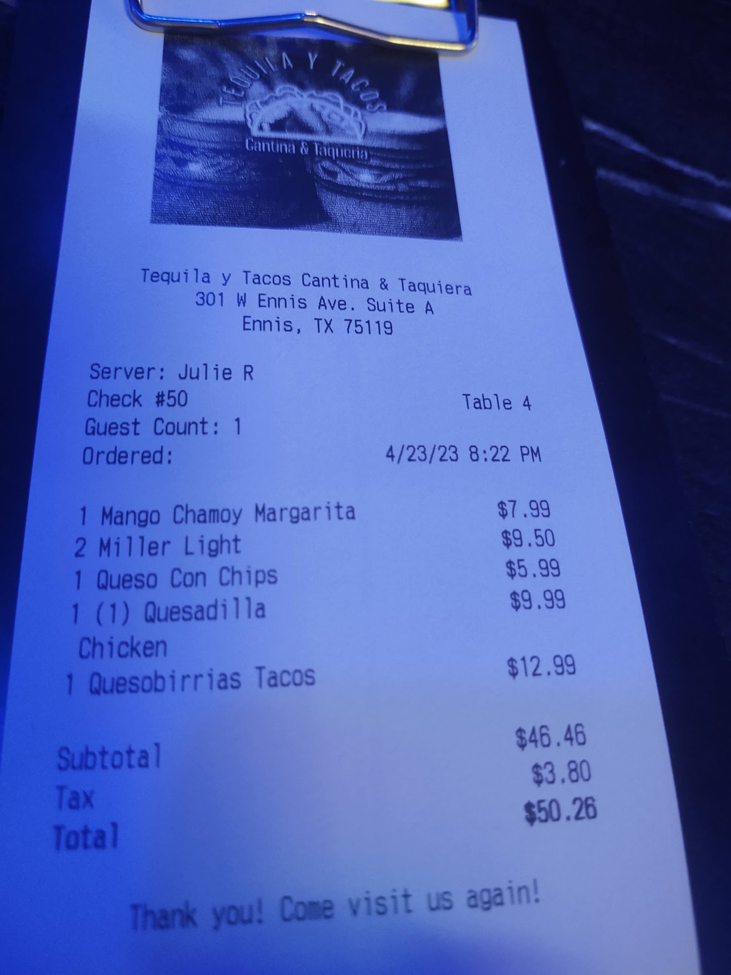 Read moreThe place only had about 6 or so other customers so normally my wife and I would say it's probably not good. But with it being a Sunday night I figured it has 4.9 star rating let's give it a shot. OMG what a great choice, I started with the Mango Margarita that was awesome. The Queso was just right. My wife got the Quesadillas and I got the Quesobirria Tacos and was not disappointed at all. The came out piping hot and very delicious. The restaurant has only been open since November but they are doing it right. Thank you Julie for the suggestion on the...
