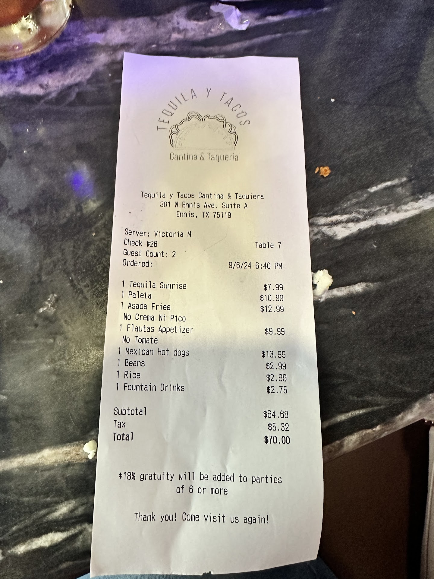 Yep, it's a bar. Not bad food, but not a nice place to eat - hard and pointy and rings like a bell (hoseable interior). This place advertises the nastiest tasting fluid known to man (tastes the same coming up as it did going down) - to drink - imagine that. After you throw that up, you won't want to eat for a while. We'll get past that and just talk about their food: My wife had a pastor con pina bowl (11) and she liked it. I had the veggie burrito (9) with guacamole (2) and I liked it as well. We split a very nice Jamaica (3). Server was perplexed when I asked her what she had for the vegetarian - she said she didn't know what that was - to be fair, she said it was her first day (of what?). Did I mention this is a bar?