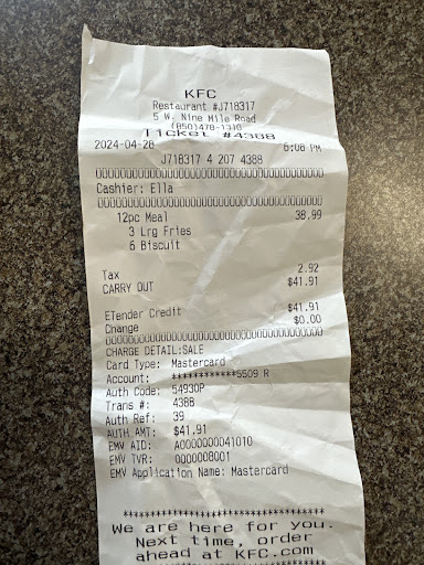 Read moreThe young man taking orders in the drive thru was very rude. On the receipt it says Joe as his name. I was rushed to order and then asked him to please give me Nashville chicken, I stated with mash potatoes and gravy and also a side of potato wedges and a Dr Pepper. I couldn't understand anything he was saying. I pulled to the window gave him the money and he never once even made eye contact. He handed me my food. I said sir are there potato wedges and mash potatoes in the bag? He said " ya there is potato wedges in the bag" and shut the window and walked off the line. The company was not busy. I go inside to speak with the manager and explain to him what happen. I asked can I pay for the potatoes and Dr pepper since he didn't give them to me and I wasn't charged but I want them? I said that is up selling for your company. The manager was very nice and said no we will just make it right for you. The drive thru guy who took my order and messed it up, looked right at the manager and said "you better get your money" and started laughing. I explained to him I am a lead key, trainee coordinator, cocktail server with Carrabbas. His behavior was un acceptable. If i was his manager i would fire him on the spot. He continued to laugh. I went to make my Dr pepper and over heard the 1 table the building had say "this place is nasty, look at the floors, look at my food" and continued to complain. I mentioned to them to contact corporate after they told me they sat there for 30 minutes listening to all of the employees make fun of a previous guest who complained about her food being cold. This behavior was ridiculous and yes the place was a mess. Trash all over the floors, trash cans over flowing. I will never return to this KFC again and I will make sure my friends and family...