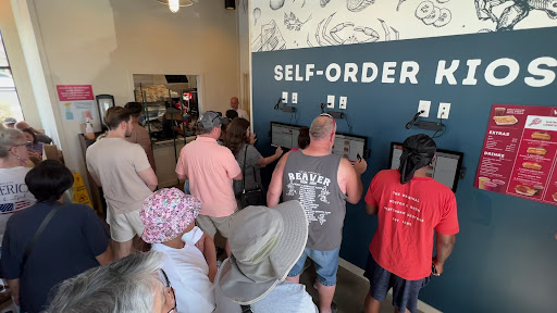 We came to check out Angie's Lobster the weekend before their grand opening. Since we came close to closing time, there was no line for us. Upon entering the store, there is a menu and ordering kiosks on the right hand side wall. After you order, they will call you to pick up your order at a window. They operate very similarly to a fast food restaurant, but don't offer any utensils, ask you to wipe down your table after you're done using it, and provide all sauces in packages.