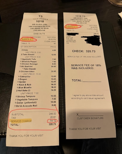 Billing problems We had 6 adults and 1 child in our party, not guests of two. We noticed they automatically charged us service fee, but we reviewed the menu and no where does it state where a service fee will be included when X amount is in your party. We noticed the serviced was higher so we clarified with the server what was the percentage supposed to be and she replied 20% Even though we noticed they charged us service charge after tax and not before AND not exactly 20%. Not even sure what number they punched in to get to that amount. We didn’t want to make a scene and just agreed to never come back again. They bring us back the signing receipt and in bold it reads, “SERVICE FEE OF 18% WAS INCLUDED”. This is when we waved down both servers to question about the over charging. We explained to them our frustration, how do you tell us 20%, when it’s not even right to begin with, but we said we let it go, but then you show us a receipt that we are supposed signed with a different percentage amount on it. At first the server kept insisted that they just charged 20% and that the final amount it’s correct. We corrected them by telling them that they shouldn’t be charging us service fee after tax and even then the amount was incorrect. And now there’s another receipt that reads 18% was included, which one is it? They proceed taking out the calculator and goes, oh the amount isn’t right but we don’t what happened and just walked away without telling us if they are going to refund or void the payment. After 5 minutes of watching them talking to someone from the kitchen and giggling amongst themselves, we just signed and left. As we walked out they just apologized and insist they don’t know what happened.