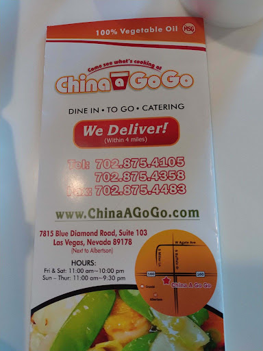Read moreChina A Go Go is usually pretty good and uniformed ( prepared the same way at every location), but this location borders in-between one and two stars. I ordered the sweet and sour chicken with half rice and half chow mein and my wife ordered the sweet and sour pork with the same ' rice and chow mein '. The chow mein was spot on, the fried rice on the other hand was very dry and lacking in flavor!. The sweet and sour chicken and the pork were both over cooked to the point of jerky status and the vegetables were under cooked, cut too large and greatly overwhelmed the meal. Removing the undercooked vegetables from each combo meal filled a standard size soup bowl!. I also purchased an order of spicy egg plant and tofu and It was more like " eggplant, eggplant, eggplant and try to find some tofu " when I finally found tofu it was like chewing on a rubber balloon and the inner soul pad from a shoe!! I do like China A Go Go, just...