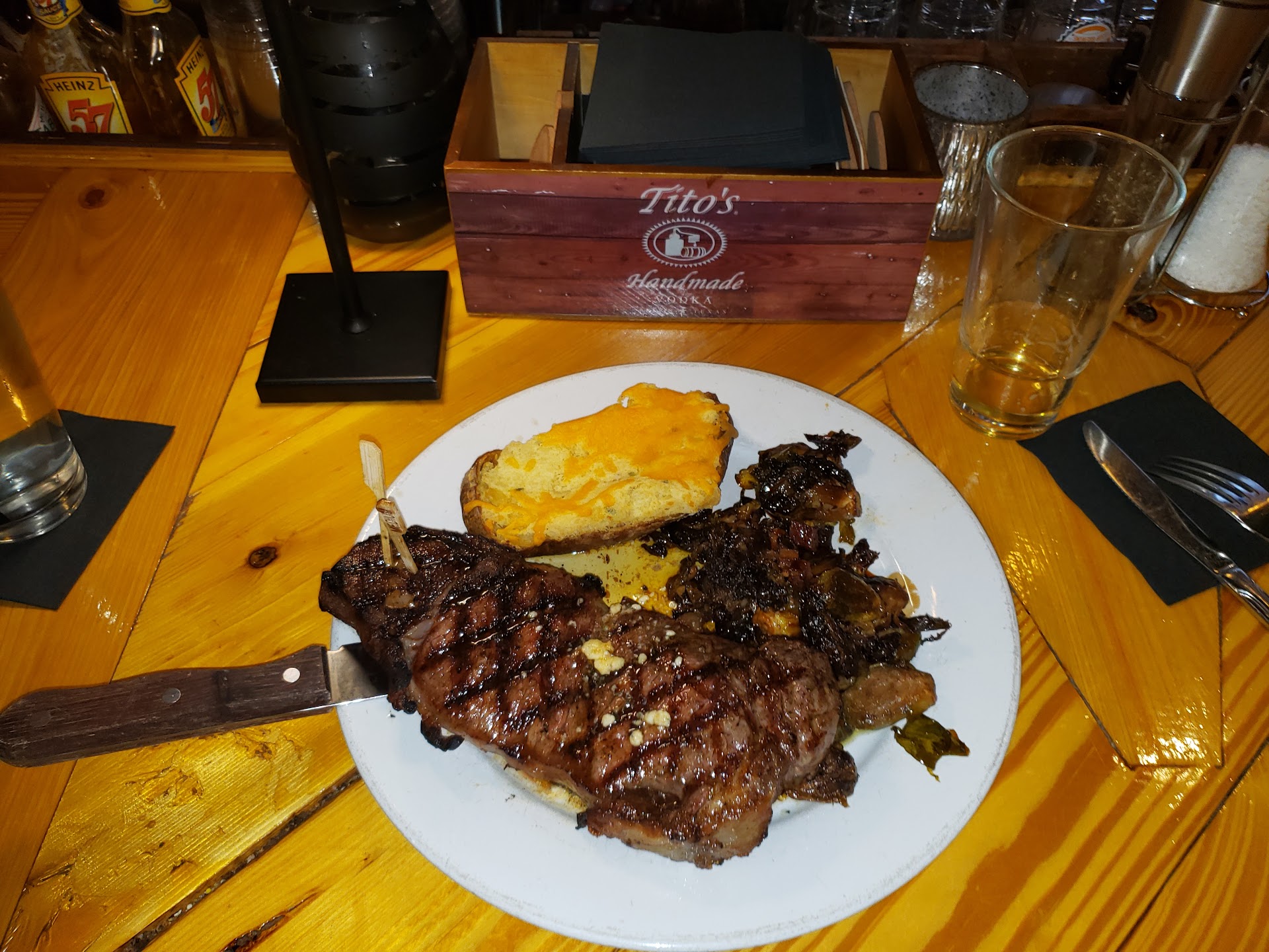 Read moreWe were extremely disappointed in the food and the way the manager handled the situation. For a table whose bill was around $400, their level of care for the situation was ridiculous. We ordered the special 16oz ribeye, and the special filet mignon. We also had a Togo order of the 16oz ribeye and a chicken salad. When the steaks came to the table they were both leathery and tough on the outside. The ribeye was mostly fat. The side was “CRISPY” Brussels sprouts. The Brussels were literally mush/slop. When I addressed the fat on one of the steaks the waitress didn’t offer to make it right but she did say she could bring me green beans to replace the mush on my plate. When I ordered the salad to go I specifically requested plain chicken and confirmed there were no seasonings on it (such as blackened chicken). I wanted to be clear that I just wanted a plain piece of chicken. I checked the Togo order after we paid the bill and I noticed there was pepper seasoning all over the chicken. I asked the waitress if she could please get me a piece of chicken that was unseasoned, like I had asked. And instead of remaking the entire thing, I just asked for the piece of chicken. Then she brought a plate to me and asked me to give her the chicken back out of the Togo box- WITH NO UTENSILS. My jaw dropped to the floor. First of all, this is just weird that someone would ask you to pick out the part that they got wrong. They should have remade the entire thing. We aren’t at McDonald’s. I just dropped over $400 at this restaurant. I looked at the waitress and asked “am I supposed to pick this out with my hands?”. She walked off. At this point we were extremely aggravated and decided to just leave. As I was walking out I heard the manager ask the waitress, “did you get the chicken?”. In what world does an establishment like this care if we got the chicken!? How about, “let’s remake the entire salad for them”. Worst experience and worst food ever! I highly recommend Moms cafe off of bollweevil circle. We ate there the next morning for a fraction of the price. The service was great and when they messed up one of the orders, they told us to keep it and take it home to someone. They handled the situation like any other restaurant would. And our entire bill was the amount of one of those crappy steaks. Will never go to this restaurant and will be sure to share my experience...