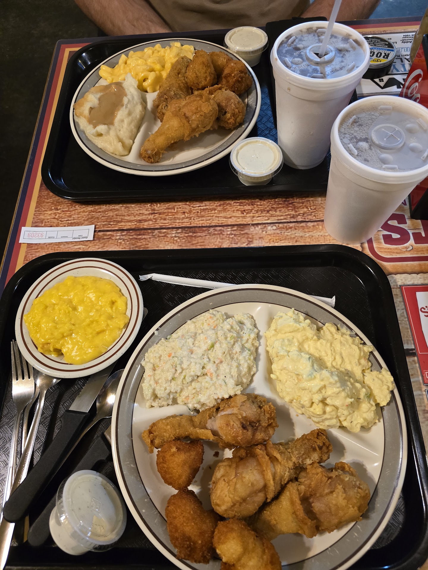 I am a huge fan of locally owned restaurants. There is a dear spot in my heart for good country cooking. This place is covered up everytime I ride by so we were excited to stop in and see what all the fuss was about. The line forms to the right in cafeteria style. You are faced with options that are dipped up for you and then you choose and fill your own drink. The first person we encountered was a young female doing the dipping. She was in a hurry and borderline rude when she ignored my mothers request for cranberry sauce and rushed to fill the next plate. Efficiency is fine but it should always be friendly. We paid 20.00 for a meat, two veggies, two sweet teas, and a slice of pecan pie. The rest of the staff was friendly and accomodating. The food however was not worth the money by any means. All of our meat and side items were room temperature or cold. Even the gravy was tepid. My mother's sliced pork did have wonderful flavor but was also not very warm. The tea was good and tasted fresh. After we sat down we were waited on by two women making rounds with refills. They were prompt and nice. When I asked for a little side of ranch dressing (to dip my cold rubbery chicken tenders into), I was given an entire bottle of kraft dressing. This is not the usual way to serve individual sauces and can pose a health risk. Other than the food being way under par for the price and the girl in the cafeteria line, the place was fine. We both left wondering why the restaurant was so popular. I doubt we will ever...