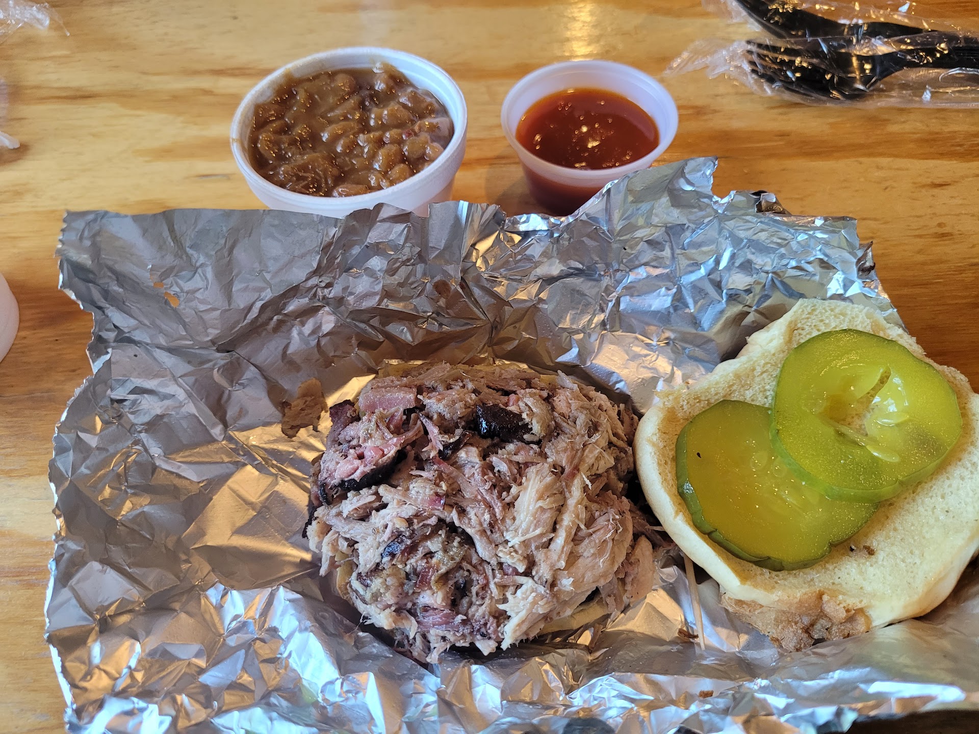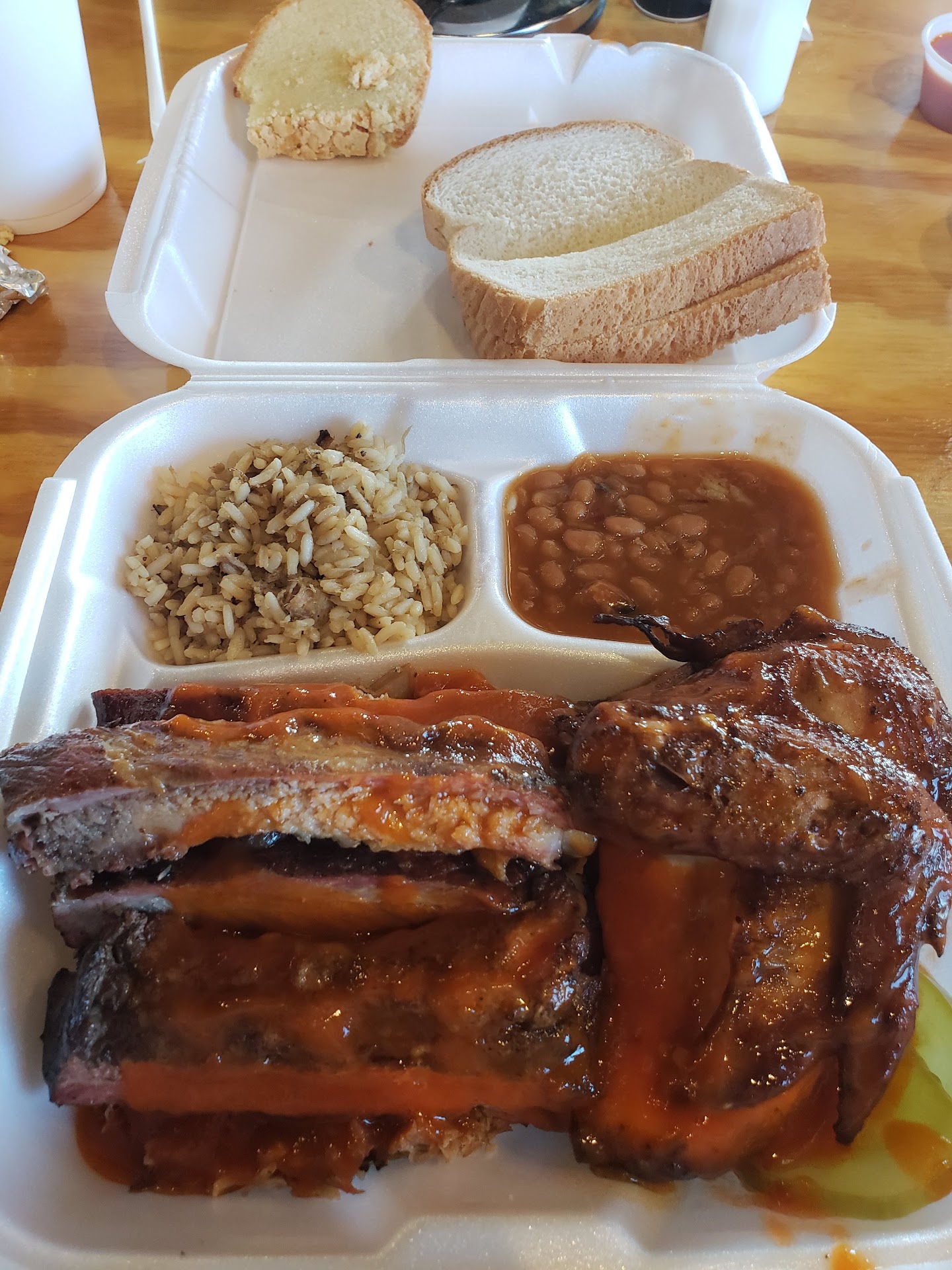 Read moreThis place was a real disappointment. Our food was not at all what others made it out to be. We ordered the Whipersnapper (a sample of all the meats) and the half of ribs. The ribs had no flavor whatsoever, the meat was coming off the bone easily but it had no taste. Then the mild sauce was so watered down it tasted like water with tomato and vinegar. It was pretty bad. The chicken was nothing special. Tasted like a basic rotisserie. The pulled pork had a very weird flavor. When you added the sauce to it, it made it worse. The baked beans are from a can, and the French fries are the crinkle cut from the freezer section. The so called amazing pound cake tasted like cardboard. I had to spit it out. Wasn’t moist, had a weird taste, just bad. When we went to refill our soda we saw that all the bbq pits weren’t even on so it showed that the meat was most likely not cooked on it, or It was cooked earlier and then reheated. Nothing tasted like a southern BBQ joint. It was more like a fast food version with the price of a high end place. It was edible but we just left really disappointed, wouldn’t...