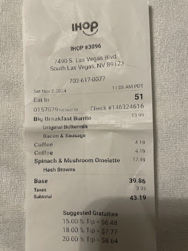 Read moreI haven't really had a decent experience at any of the IHop restaurants here in Las Vegas but this one is by far the worse. The staff is extremely rude and unprofessional. I came here with friends visiting out of town (and they wanted IHop) so this was the closest location from their hotel. The music was extremely loud I could barely hear my friends so we kindly asked the waitress if they could turn it down a bit so she laughed and said she would go see if she could. She never came back and we had to get the manager who rudely tells us we were the only ones complaining about it and I was like really? I could barely hear you. He turned it down and we continue to wait for our food. The waitress never came back so another girl comes and places the check on our table. Um we haven't even received our food and already we have a check? We asked for the manager again and he goes to ask the waitress what happened and she said she thought we asked for it. ??? We never even spoke to this new waitress and the other one just disappeared. Why did she think we needed our check now when we didn't even get our food yet. The manager said the other waitress left and that the new one was going to take care of us. Couldn't the other just have told us she was leaving or the new one could have said that too and introduce herself? Anyway our food did not come out all at once which is always a big mistake to do anywhere because a group always wants to eat together don't you think? That's why a group goes to a restaurant together so they can all enjoy their food as a group. Mine came out first and my friends had to chase down their orders. The food was okay but we were done with their lack of customer service. We took the rest to go and left. We didn't even bother taking to their joke of a manager since we could clearly see he didn't know how to do...