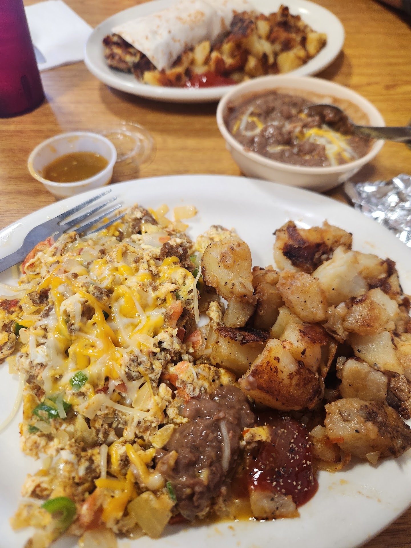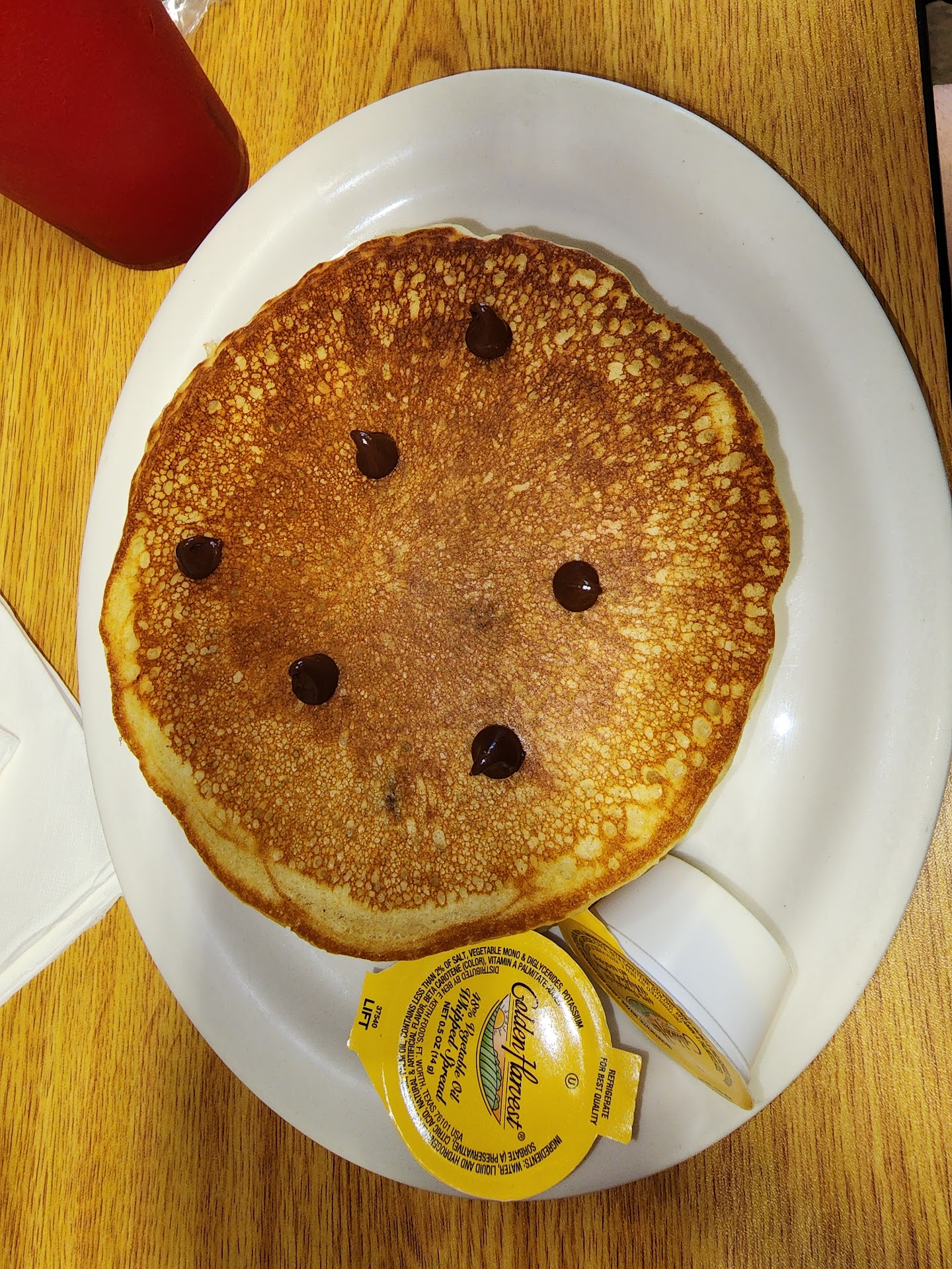 Read moreWe stopped at this place to meet some friends for breakfast on a Saturday morning around 9 am. It wasn't too busy. It got really busy around 1045 am. There were people waiting inside and outside for tables. Service was slower but waitress mentions that they were busy to please be have some patience. Pretty decent sized menu and the prices were very reasonable. My husband ordered an omelet, it looked like an egg scramble but he said it was good. I ordered 2 scrambled eggs with bacon, hashbrowns and buttered toast. Toast didn't have much butter. Hashbrowns were amazing. Bacon was perfectly cooked. My son ordered chocolate chip pancakes. They just had a few chocolate chips on top, rather than mixed into the batter. He still enjoyed them. The portions were very filling. They have 2 different sizes on most of their breakfast choices (small and large). I like that. All of our plates were larger portions. Our friends that we met all ordered omelets with the fries (they erred actually fried potatoes). Kids meal was 2 pancakes, eggs and bacon. Everyone had full bellies when we left. We had to ask for refills on drinks, instead of the server just bringing them. Could have been because she said they were busy. She was very friendly though. When we checked out th3 cashier checked in to make sure everything was good! They offer...
