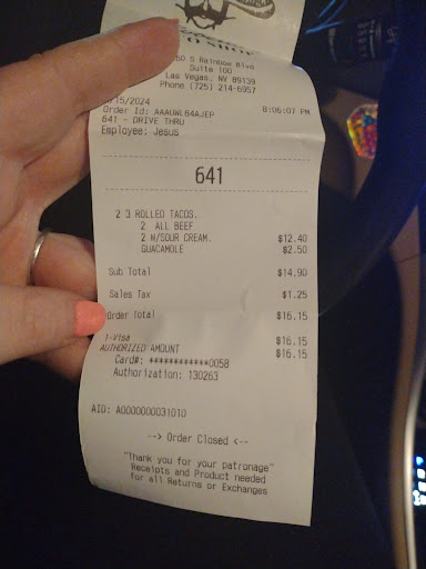 Ā Ā Ā Read moreI Ordered two things on the menu. One order of beef rolled tacos and one order of chicken rolled tacos with sour cream and guacamole should be $6.20 per the sign. Do you drive through attendant tells me that my total is going to be $16. So I asked the attendant at the drive-thru "why is my order $16 when rolled tacos are $6.20 each? .The sign says with Cheese $5.50 Sour cream $6.20 guacamole $6.20