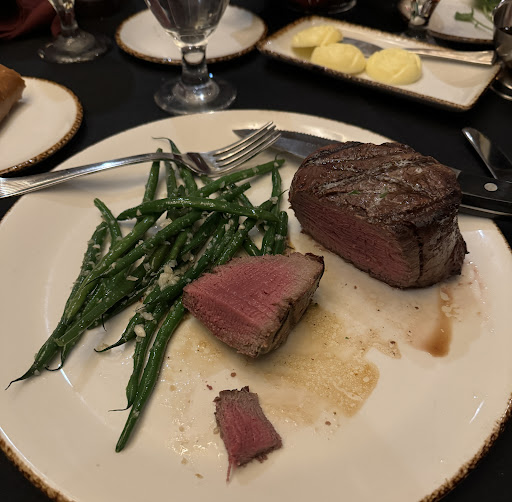 Read moreOur favorite special occasion restaurant! Dry aged beef perfectly cooked to order, and you get a nice tossed salad and choice of baked, mashed or asparagus (get the baked; fluffy on the inside with a salty potato chip-like exterior.) For the last few years I've stuck with the boneless New York Strip, cooked medium rare, with just salt and pepper to season as far as I can tell. Incredibly juicy, and with that slight buttery funk you get from dry aging, it's just a sublime eating experience. My wife always gets the 12 oz prime rib, cooked medium, then light charred on the grill. Also a great dry aged cut and served with plenty of au jus and horseradish. We hear their other dishes are good (pork, lamb, chicken and seafood), but when we go to a steakhouse, we're getting beef. The service is always impeccable and the atmosphere is unapologetically old-school, which adds to the appeal for us. We can get a generous meal for two for around a hundred bucks, and we always feel like we've gotten a delicious, deeply satisfying bargain...