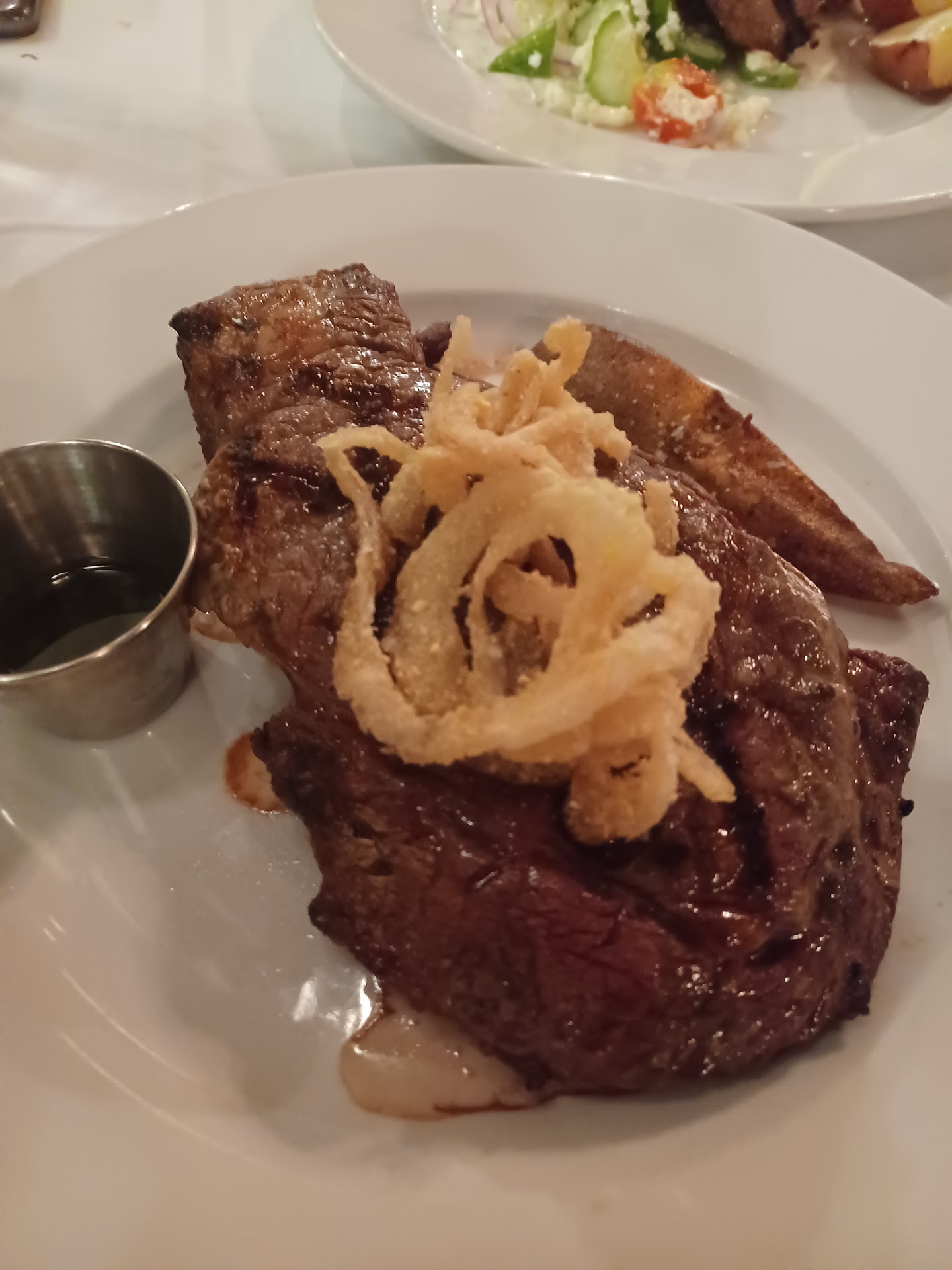 Upon arrival, I was surprised to see the greeter was at the back of the restaurant. My wife and I were seated at a reserved table for two although other couples were seated at tables for four. Of course my wife had to remove a serving tray from her seat to sit down. We had a charcuterie board and salad for starters. The salad was fine but the charcuterie board had a mystery meat that was the most vile tasting thing I’d ever tasted. Although relatively large the charcuterie board was no better than average although pretty expensive. I ordered the seafood pasta while my wife ordered the 12 oz ribeye, well done. It was under cooked and had to be sent back and cooked longer. The ribeye was the most lean ribeye I’ve ever seen. I would have thought it was sirloin by the lack of fat/marbling. Because it was reheated, apparently so were the potatoes…they were burned. My pasta dish had good seafood but the shrimp had the tails on which had to be removed and discarded because the sauce was too heavy to peel the shrimp tail without getting messy. The sauce tasted more like straight tomato sauce than anything else. Scallops were very good. Mussels were okay but required using hands to hold the shell and scrape the mussel out…messy. The fish, and artichoke hearts were fine. But the sauce was underwhelming at best making this dish unworthy of its price. Overall, this experience was a disappointment. We have had great dinners in previous visits but this meal frankly was not very good. It certainly wasn’t worth the $150 price tag. I don’t like to eat food that isn’t very good at no cost and certainly don’t like to pay a premium for the disappointing experience we had. As I write this I am enjoying a nice stomach ache since dinner. Not what I was hoping for. Probably won’t return after such a ruined 29th...