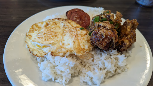 I ordered a sampler or sorts: 2 eggs, Portuguese sausage, and 3 pieces of the Korean fried chicken (Teriyaki glazed). I of course also got 2 scoops of rice with it (can't remember if my plate had mac salad too). The chicken was FANTASTIC. A wonderful crunch and the teriyaki flavor was exceptional. The eggs were requested over-medium and were overcooked. The macaroni salad, as I said before was fantastic. While I'm not a big rice eater, the sauce from the chicken, that bled into the rice made the rice amazing.