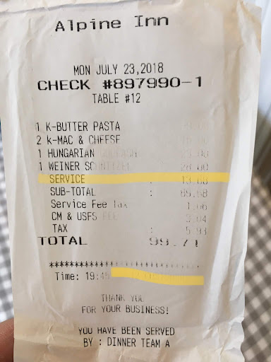 I honestly thought we were being stereotyped as bad-tippers from the very beginning--and therefore received poor service--because we have three kids, we looked harried from a miserable hike, the kids were grumpy but not misbehaving, and we only ordered water because, again, long grueling hike. Whether we were pegged (wrongly) as poor tippers or not, we waited longer than usually is acceptable (sorry, I didn't time it) for our server to come and she quickly said "Do you know what you want?", which we did, so we ordered. Only as we sat there waiting for our food did I notice her go around to her other newly-sat tables and engage in pleasant conversation with them, tell them the specials which were never told to us, and continue to make sure their drinks were filled (ours ran out) and continue to schmooze them with chatter and kindness. We were largely ignored and never felt anyone was friendly toward us. As I again wondered aloud to my husband (who used to be a server, so not only do we tip very well ALWAYS, but he affirmed that yes, we probably were being categorized as "not worth the effort" by the staff) I had to take the baby outside as he became cranky while my husband waited on the check. It took forever for the check to come, and he was appalled to see that we had been billed as a party of 12 (check the receipt - meals for 5 people and the gratuity had been added for a large party). Clearly they expected us not to tip well and treated us poorly because of that. Normally, regardless of the kitchen, we would tip between 30-50% for excellent service, and still 20% for lesser service. Either way, more than the imposed 13% they tried to force on us. I was disgusted.