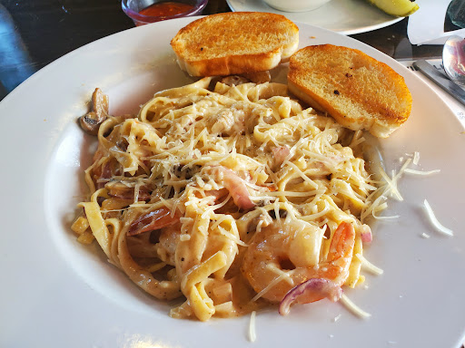 The food was delicious, well prepared, and came out very quickly. My wife had chicken Alfredo, and I had the "Cajun" shrimp alfredo. I put Cajun in quotes because it slightly missed the mark. A small trace of red onion was the only hint at any part of the holy trinity touching this recipe, and a few thin sliced Andoulli suasages were their to help pay lipservice to "Cajun" cuisine. Some old bay seasoning or even just a touch of celery salt and a dash of crystal hotsauce could have gone a long way to spice up the dish, but as it was, it was a mildly seasoned creamy shrimp alfredo. This is probably nit-picky, but it was a $30 plate of pasta after all.
