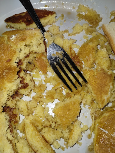 THE FOOD QUALITY My eggs weren't cooked right. I ordered over medium & received a very slimy over easy, so I sent them back to be cooked a little longer. They came back extremely rubbery, almost as if they were microwaved, I could barely cut them with my fork. The pancakes couldn't even be picked up with a fork. They immediately crumble to tiny pieces. They were also very bland & flavorless. My husband ordered chocolate milk, the milk to chocolate ratio was awful!! (I don't know if they make their own or not, so this might not be a problem they created) The portions were very large, so if we were actually able to eat our food, it definitely would have filled us.