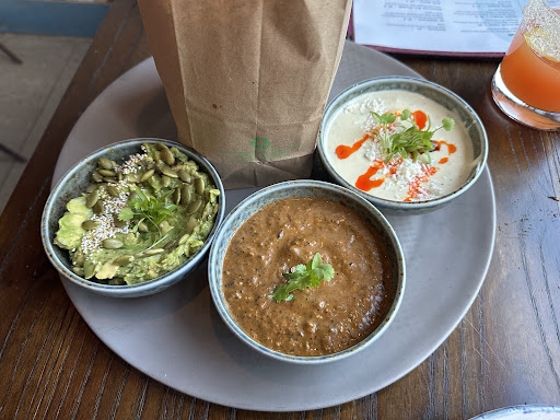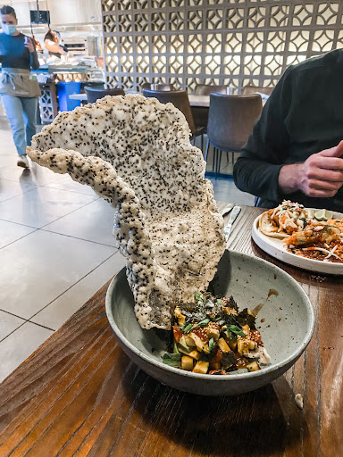 Food: I tried the edamame and birdhouse flight for my appetizers, and tonkotsu ramen and carne asade taco for my entree. Let’s start with the birdhouse flight: we had the salsa with cinnamon and cloves (it starts with a b, ask your waiter for the name) offering a unique twist on salsa as we know it. But wow, when I tried it my mind was blown, it was no longer a salsa but a beautiful dipping sauce packed full of flavorful spices and a slight hint of tomato. The guacamole was also very good, it had pepitas on top offering a nice crunch and salty flavor. It had a good spice mix and it tasted very fresh. The queso was my least favorite of the trio, but it was still good. There was nothing too outstanding about it. I would say eat this when it’s fresh and hot because the texture changes as it gets colder. Next up, the edamame. Wow, this was my favorite thing out of everything (entrees included). It had flaky sea salt on top offering great flavor, and the beans were cooked nicely. The dipping sauce was like nothing I’ve had (okay maybe it is just not served with edamame). It had a mustardy flavor, but also sweet, and salty. It was just comfort and happiness in my mouth with every edamame bean. The carne asade taco was actually, in my opinion, not the best, it had a good sauce and good amount of cheese, but the meat wasn’t that great. It was dry and a little chewy. It wasn’t worth the price ($6.5). The tonkotsu ramen was yummy. I liked all the extra toppings you could add (I added marinated mushrooms which were fantastic) making it unique to you. The pork was great, when it’s soaked in the broth for a few minutes it soaks up all the flavor. The noodles were a great texture and tasted homemade (I don’t even know if they were)!!