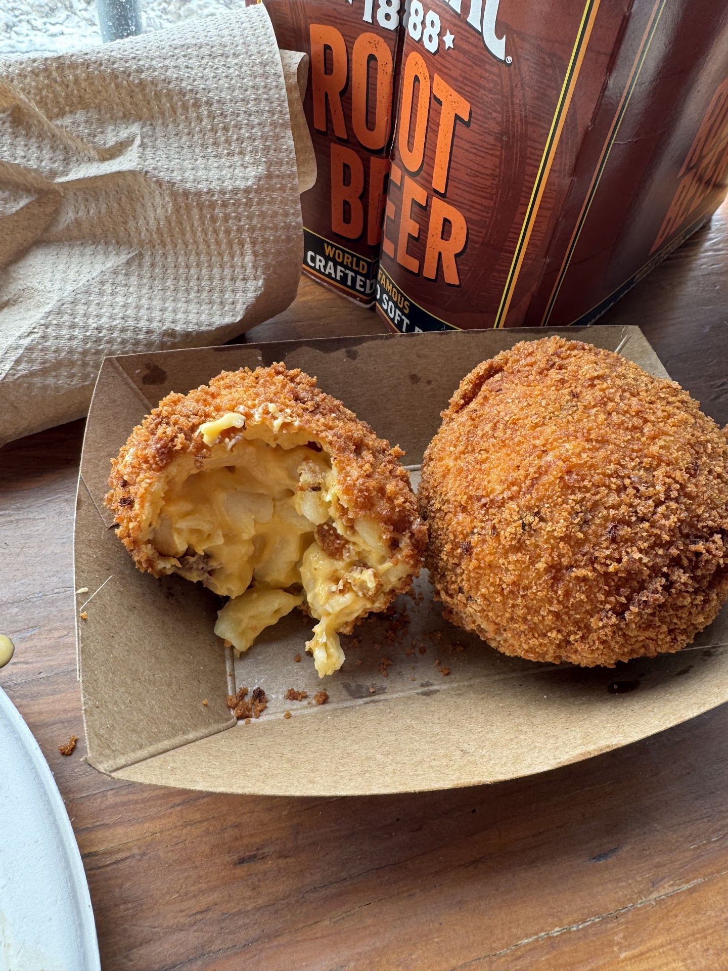 As we were approaching the front of the line, we saw the sign on the wall advertising the deep-fried brisket mac ānā cheese balls. Iāve seen them posted on their social media pages in the past, but up to this point, I had only dreamed about trying them. I donāt know who thought, āLetās deep fry a breaded ball of brisket and mac ānā cheese,ā but they deserve a statue in their honor. These baseball sized nuggets of joy were crispy on the outside, cheesy and meaty on the inside and fried to perfection.