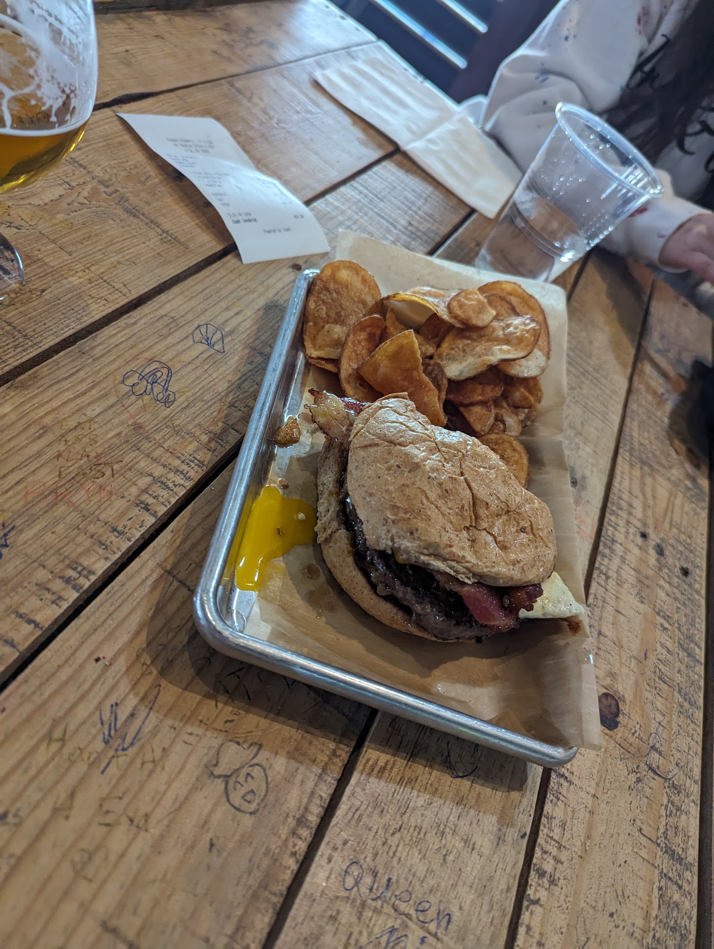 Presentation of the flights was very neat, they come on an arched wooden board of 6 (they're pieces of wood from recycled bourbon barrels) with handles on the end-- even the smallest detail of an easy to carry flight board added to the experience. Of their late night food specials, I tried some delicious fried pickles ($5 for beer battered spears and ranch!) and couldn't have been happier.