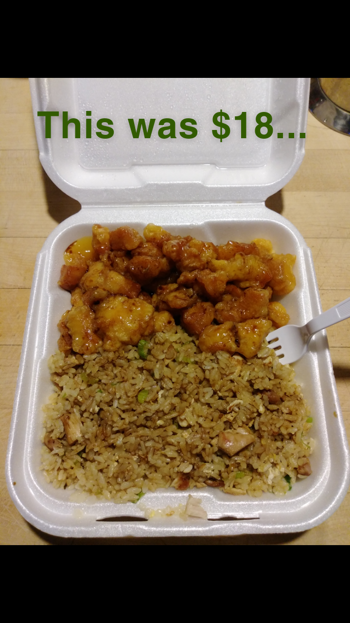 Came here on a whim because I knew I wasn't going to have time to cook dinner. Upon first entering, I got a whiff of that classic "we haven't changed our air return filters for our AC in a year" smell and it was pretty warm inside. Definitely not comfortable warm... sticky warm. Not fun in late August. And there was also a rather pungent aroma of not so fresh fish... Despite these things, I went ahead and decided to order... definitely to go instead of dining in. The young man who took my order was very friendly and politely let me know that there were a few people ahead of me. When it was my turn to order, I ordered an Orange Chicken meal. He asked if I wanted the salad and sushi roll that came with it and I politely declined and asked if I could substitute fried rice instead... he said no problem. The wait wasn't long, only about 15 minutes and when he handed me my bag, I was a bit confused. I had still payed the full price for the entire meal so, I assumed, that I was getting a box of Orange Chicken and a box of fried rice... not the case unfortunately. I received one box. I shrugged it off and headed home. Keep in mind I just paid $18, plus the 15% tip, making it $20 and some change. Well, the Orange Chicken was super tough to chew. Bits of hard something or other in each battered chicken piece. The fried rice was pretty damn good though. All in all, the best I can give this place is 3 stars. I paid WAY too much for a small plate of mediocre Orange Chicken and they should've given me a lot more rice. I highly recommend that they get that stale, stinky air filtered. I don't think many people would even bother staying 5 minutes in that kind...