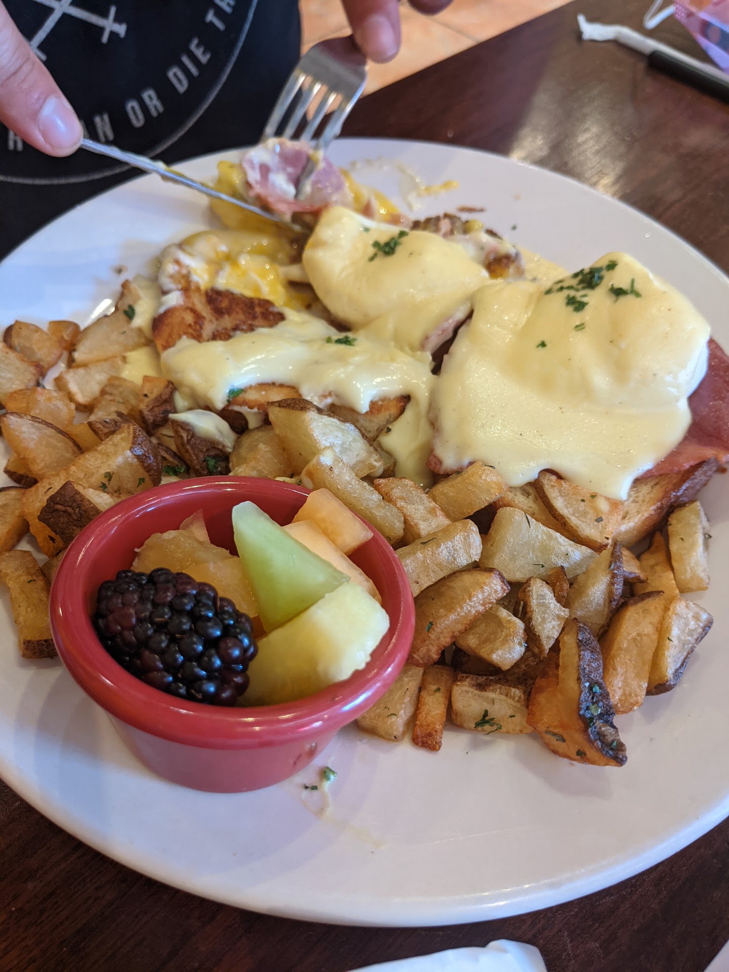 I also had the âFrench Scrambleâ breakfast served with herbed potatoes and scrambled with shallots. Both the potatoes and the eggs had a lot more flavor than you would normally expect in these items. They don't skimp on the herbs. The potatoes were perfectly cooked crispy on the outside and tender on the inside⊠The eggs might have been a little overcooked.