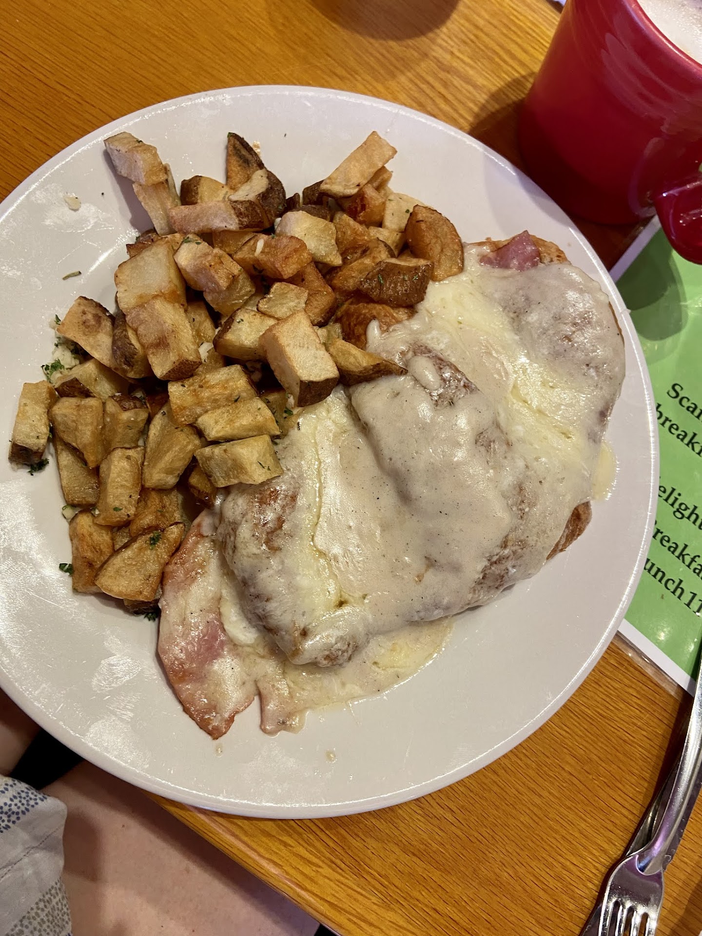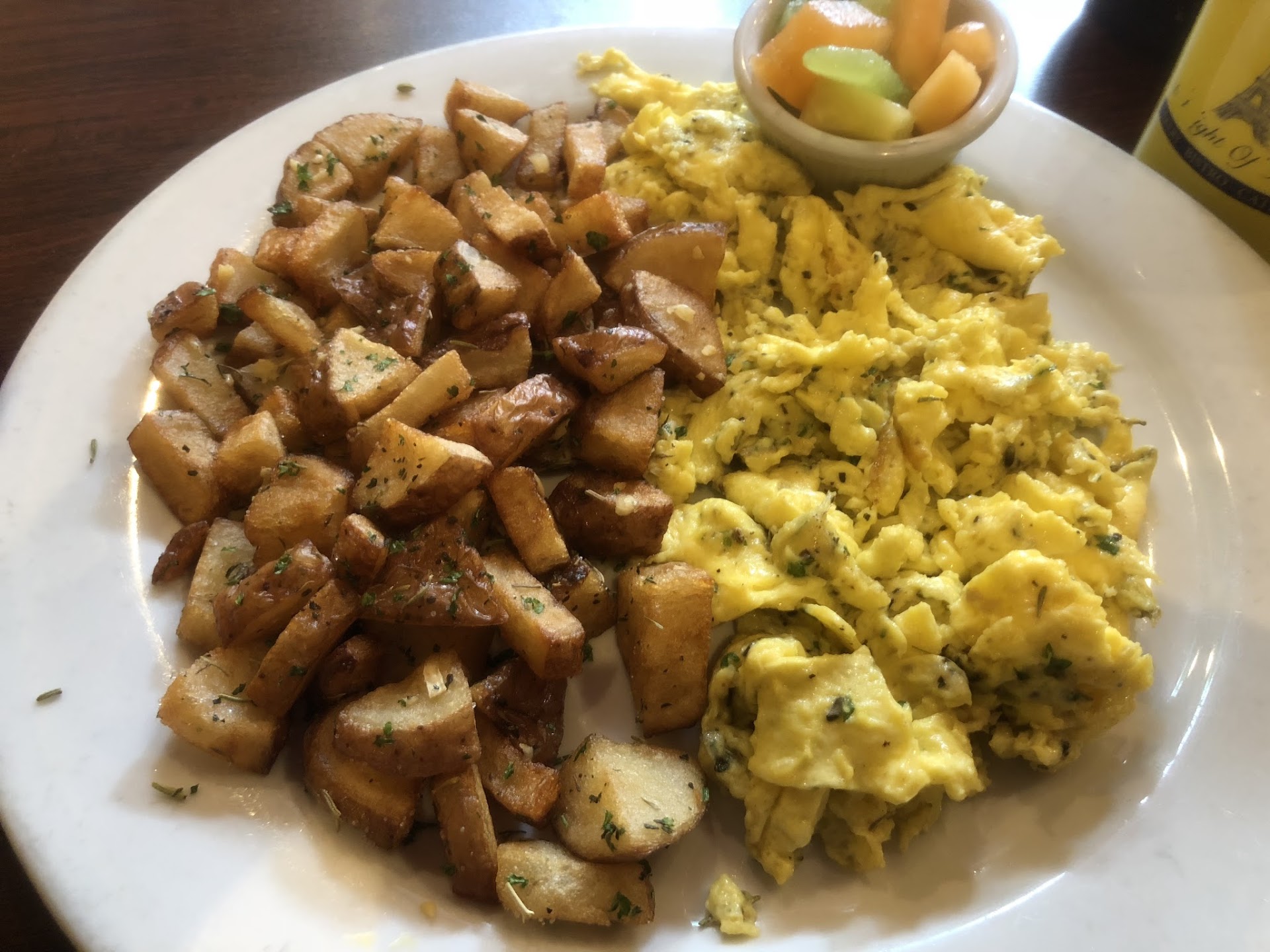 I also had the āFrench Scrambleā breakfast served with herbed potatoes and scrambled with shallots. Both the potatoes and the eggs had a lot more flavor than you would normally expect in these items. They don't skimp on the herbs. The potatoes were perfectly cooked crispy on the outside and tender on the inside⦠The eggs might have been a little overcooked.