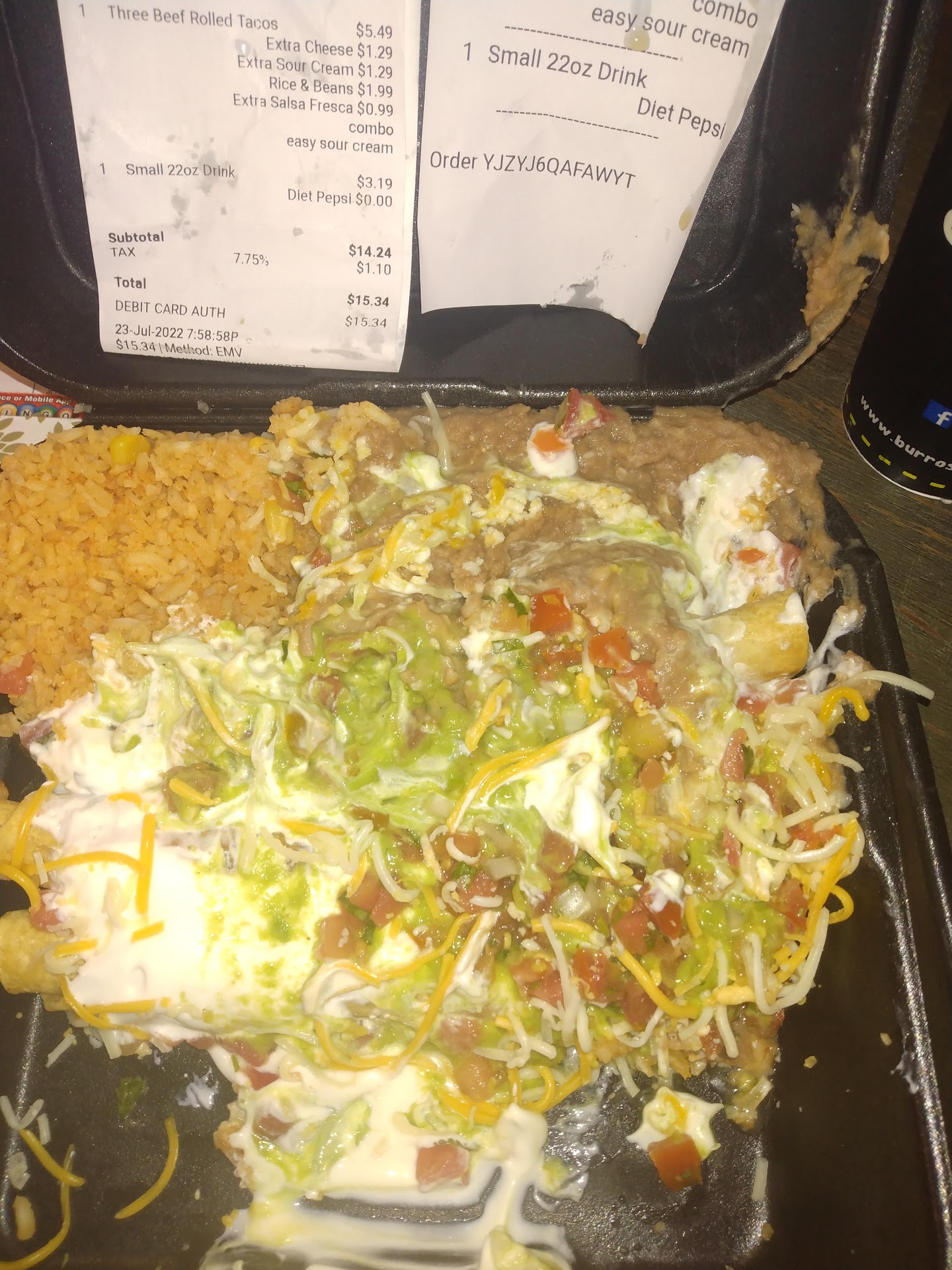 Read moreI liked this place until I ordered 2 orders of flautas and both orders had mold on tortillas as well as the chicken. I brought them back and asked cashier what it looked like to her. All she said was I give you back your money and I asked to have manager call me she said Carlos won't be in till Monday and it was Thursday. I was very upset and drove off. I kept thinking about it so I call the restaurant and told them I was going to call health department because I felt they were serving that dish still until Carlos came in. Another gentleman called me 10 minutes later and said they pulled the chicken off the shelves and it wouldnt be served. But what does that say about what they are serving or the cleanliness of the kitchen that they are cooking in. I could never eat there again, but many of my friends & my husbands co workers have eaten there and are upset because they really liked the food but are concerned about the conditions of the restaurant. So consider this a warning that even your favorite restaurant that has always served good food can be mishandling your favorite dish and keep your eyes open. I'm a very disappointed customer and hope that there will be no others who are served potentially harmful food. I wouldn't have given even one star just could find the...