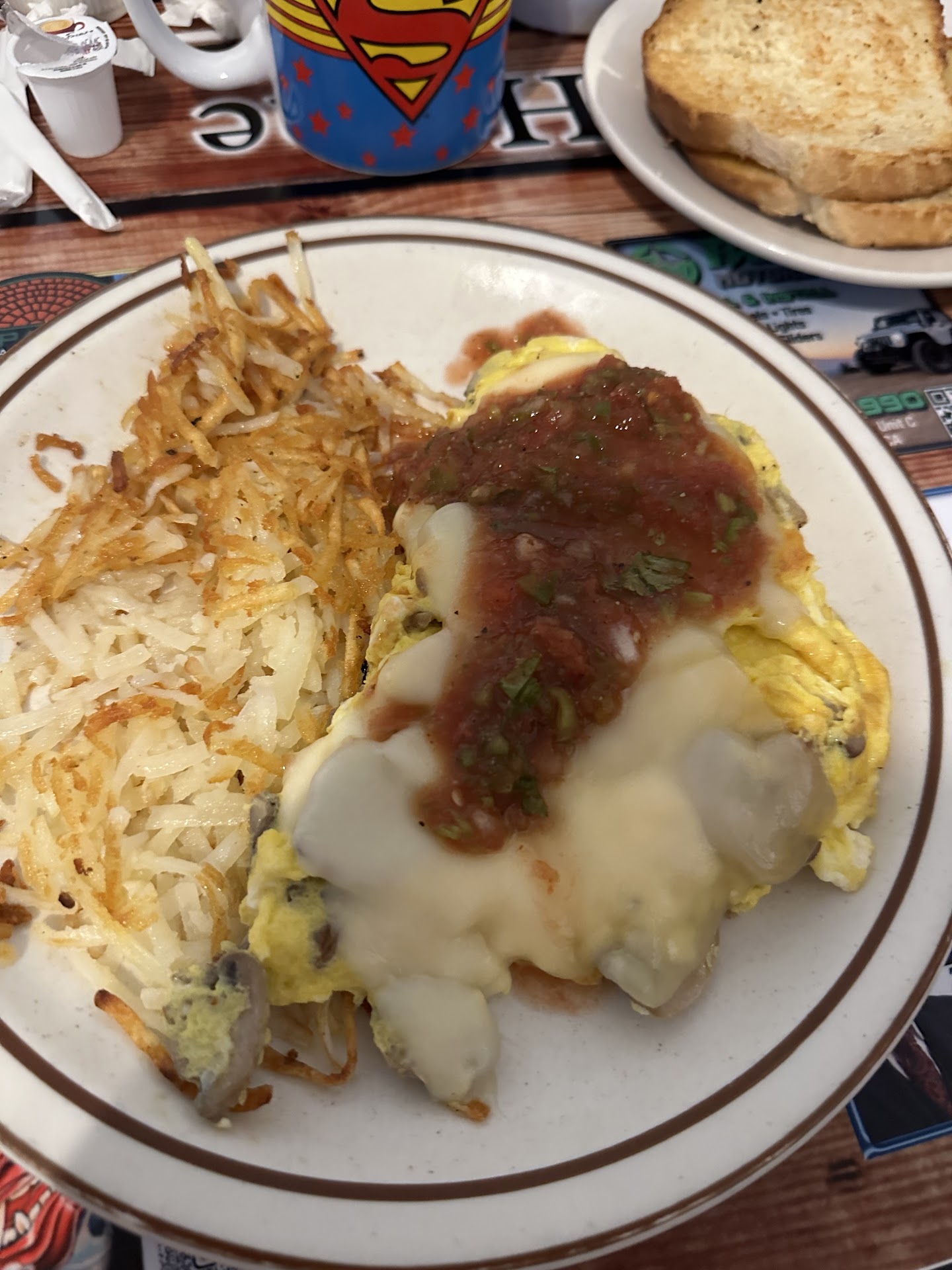 The biscuits and gravy was nothing special. It actually lacked flavor. They weren’t bad, they were just bland. I ordered hash browns instead of potatoes, and I tried to discern what was the creaminess of them. Wasn’t sure if it was the butter, or something else, it was very odd. They weren’t bad, just different. I asked for crispy bacon. The bacon was in fact cooked, but it was far from crispy. My daughter enjoyed her pancake.