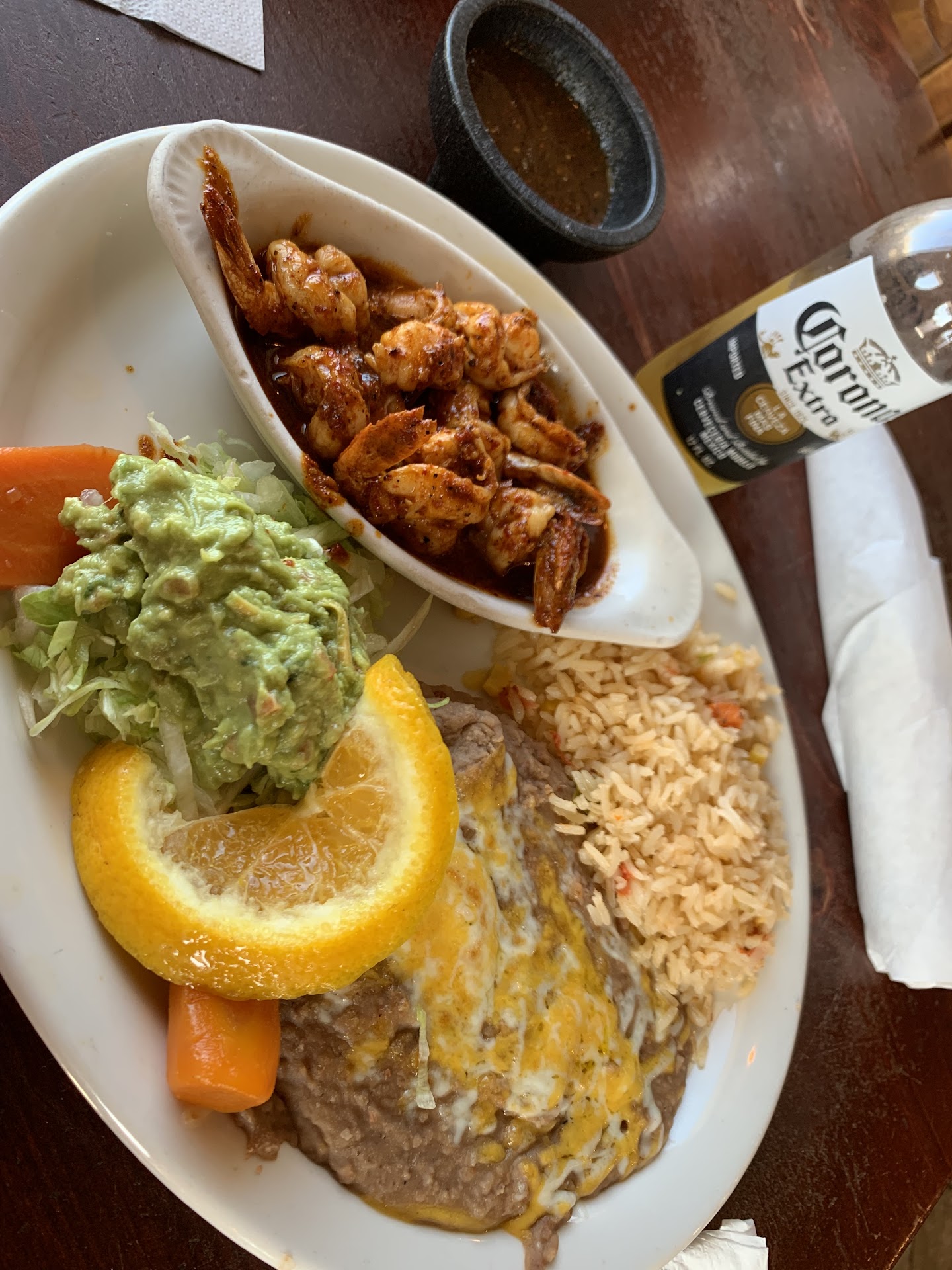 In regards to the food - overall it was great! Quite frankly, above and beyond any Mexican food restaurant in town. I order the Camarones a la Diabla. The shrimp were cooked in a well seasoned sauce! The refined beans were very flavorful and the rice was perfectly cooked! Overall, great presentation! The only negative point in the dish was the guacamole which included raw onion. At home we never use raw onion in our guacamole as the onion overpowers the soft and delicate taste of avocados. But overall, great dish!