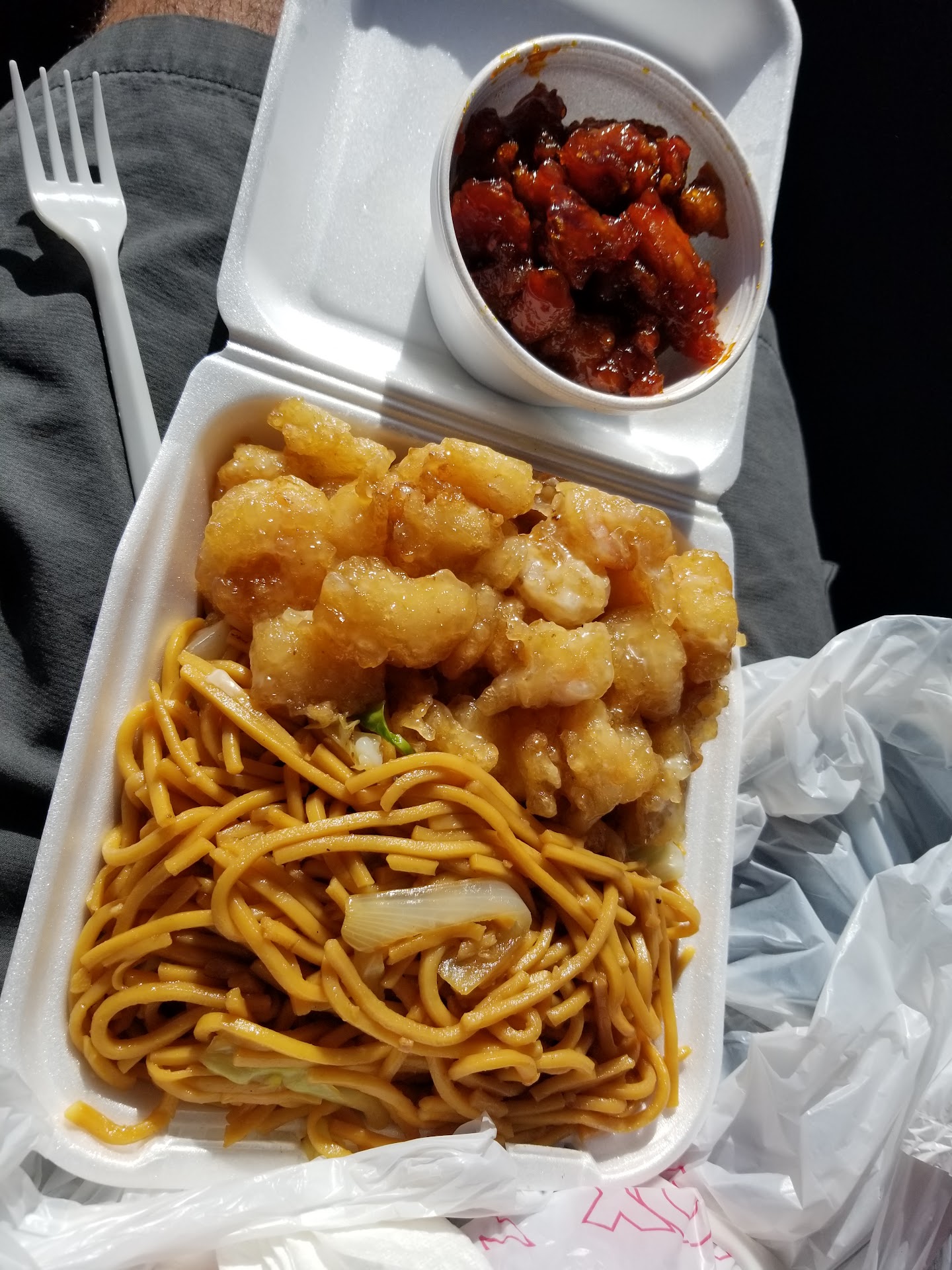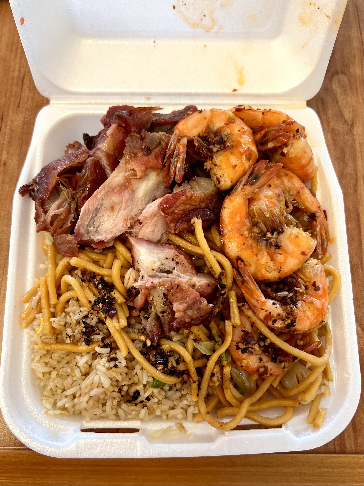 I ordered a plate with chow mein, fried rice, barbecue pork and spicy shrimp. The chow mein had good flavor and texture. The rice was a bit overcooked but had great flavor. The barbecue pork was tender and flavorful. The shrimp were juicy and definitely packed a spicy kick. I enjoyed both my entrees very much. I added some of their chili oil sauce, and it added flavor as well as spiciness. I recommend the chili oil if you like your food spicy.
