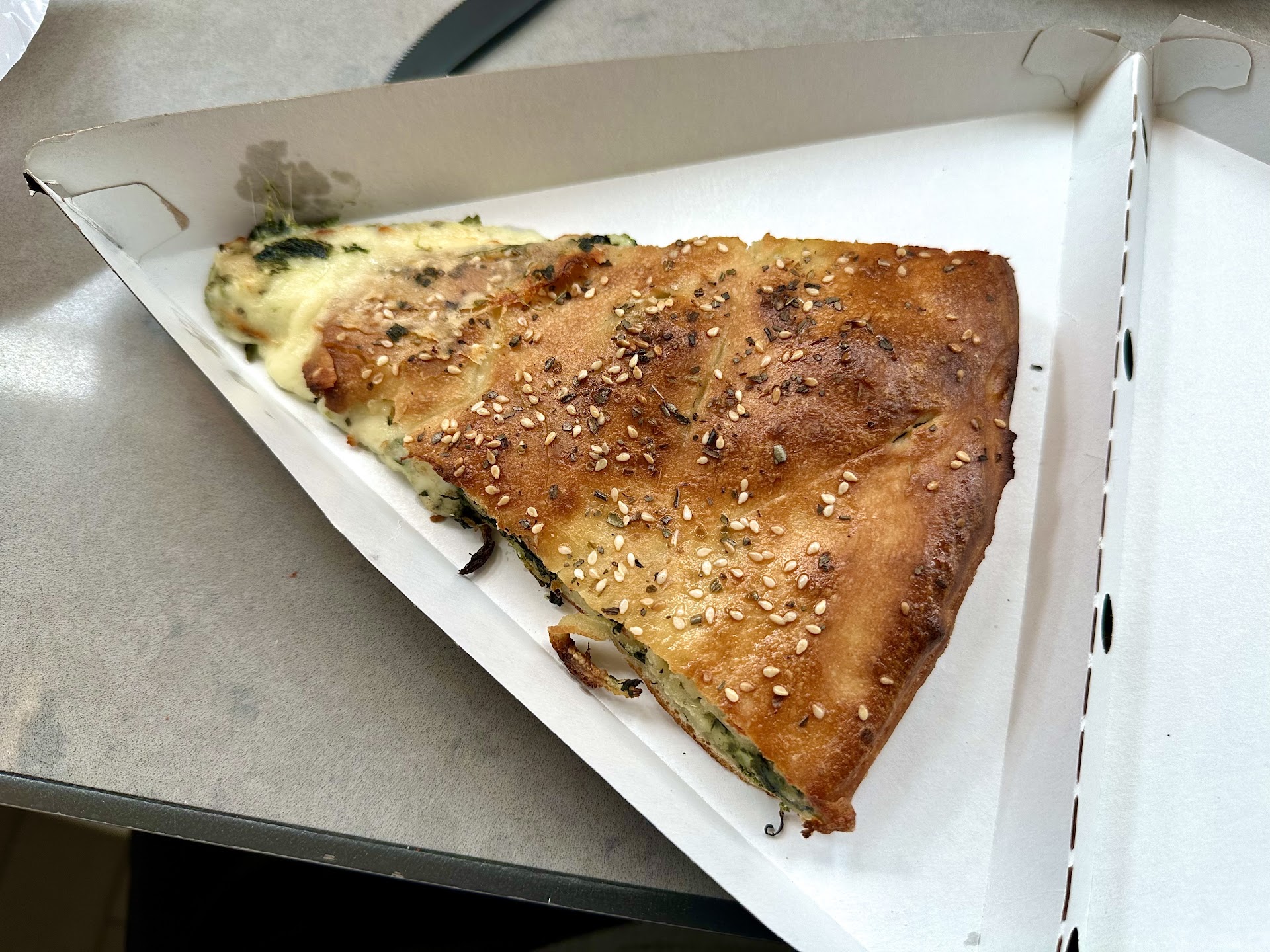 Stuffed Broccoli and Spinach Pizza: 4/5 I always see this pizza but never see anyone get it. Even on the Sbarro website, they don’t list it. Very odd. This pizza is stuffed with cheese, I believe mozzarella and ricotta, and has spinach and tender broccoli. The flavor is very mild and the broccoli is definitely the main thing that you taste. The top crust has a lovely, almost fried texture, and because the pizza is so mild, you can really taste the pop of sesame seeds. I really enjoyed this and would get it again if I ever had a craving for Sbarro.