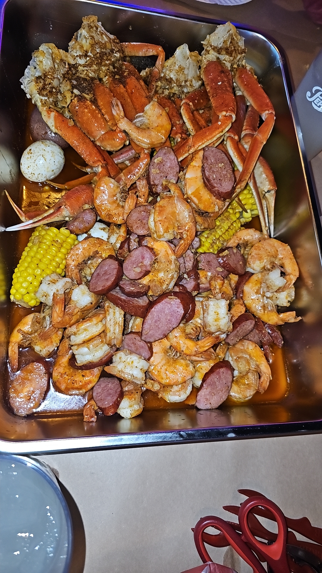 First time coming. The place is big and seats a lot of people. When we came in we were looking at the menu to know what to order. We ordered the sampler appetizer, chicken fried basket and the trio crab boil. When ordering we told are waitress we wanted it "MILD". First came in the appetizer. The calimari was a bit to chewy for me. The breaded shrimp was amazing. The hushpuppies had all the seasonings which I like. The spring rolls on the other hand were really empty and so small. After enjoying that the waitress lets us know that our crab boil was ready and if we wanted it now and we said yes. She brings it and after we are putting shrimp and what not we tell her if the other fried basket was coming. She kind of was confused and said if it wasn't out and we said no. So then she brings it. Back to the boil crab. Everything was good except it was super spicy for my liking. I felt that it wasn't mild as we requested. So our hands were getting dirty and notice our waitress passing by and ask her if we can get paper towels as our table didn't have any. So she brought it and we went through a lot since it gets messy and every bite was spicy.